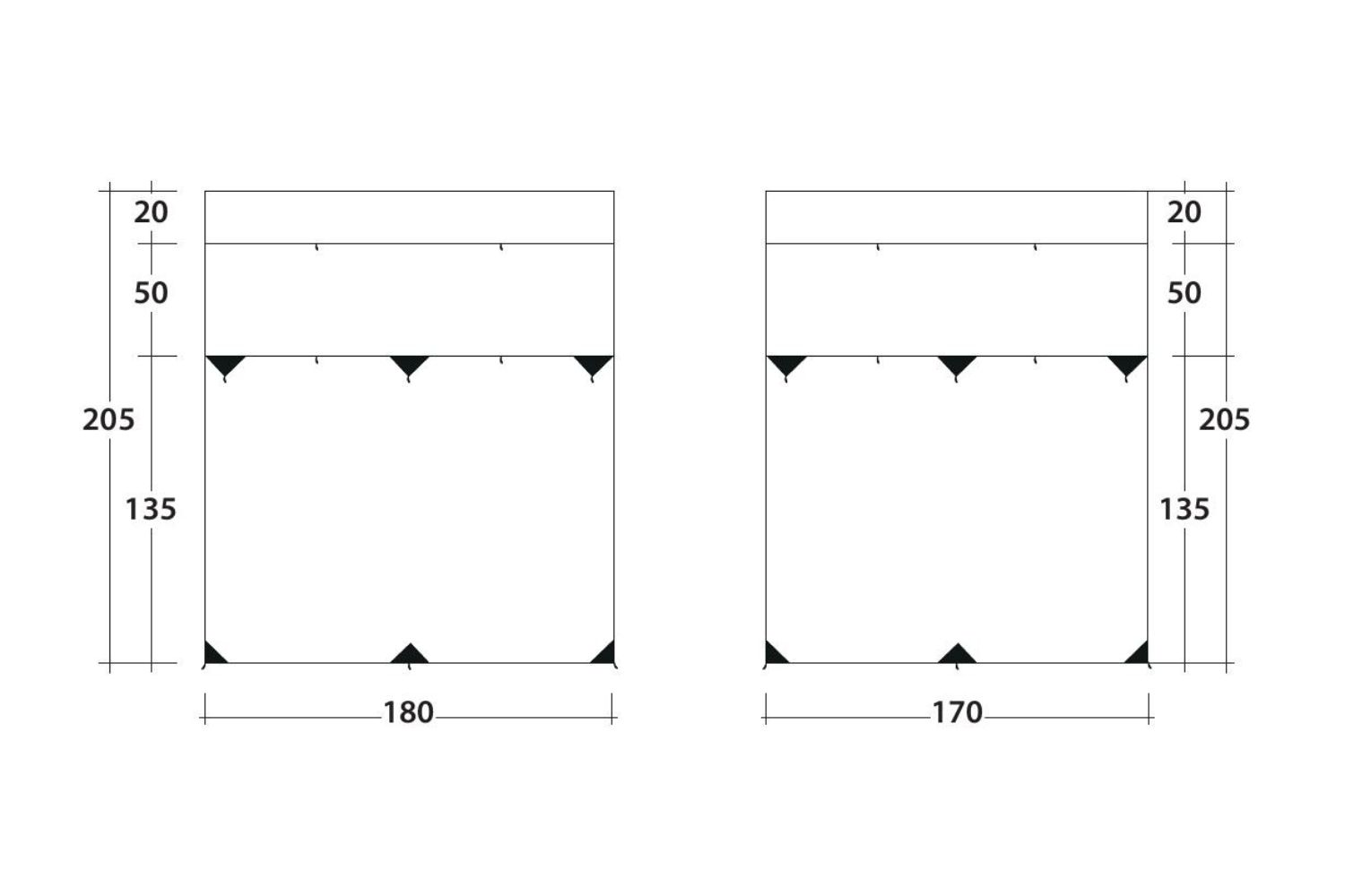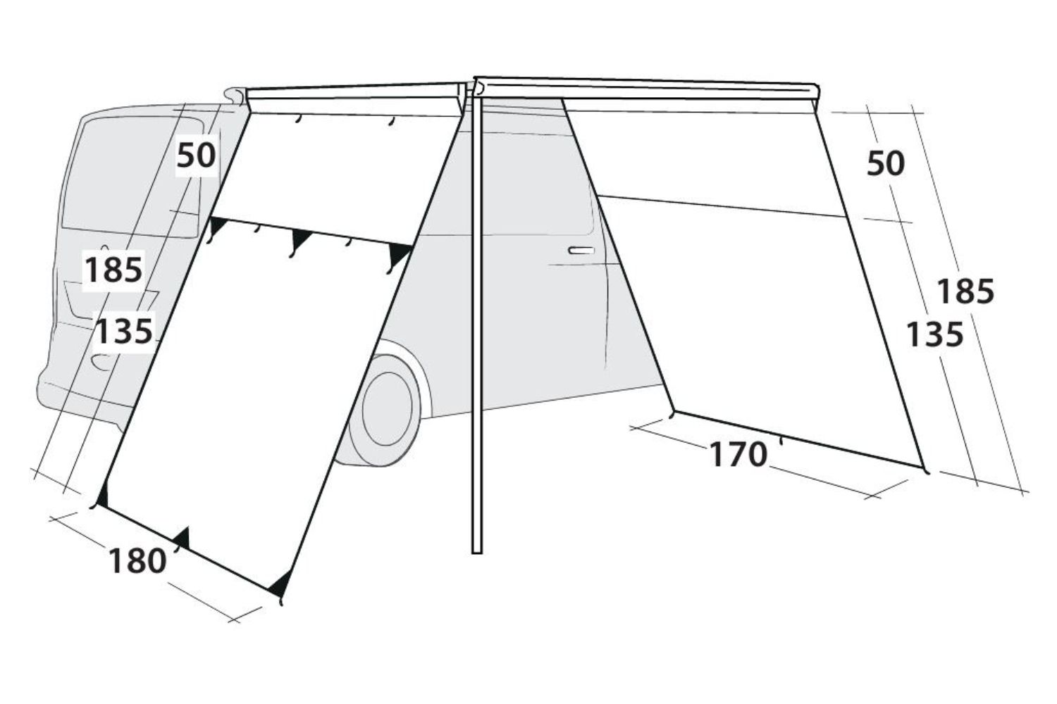 The Outwell Fallcrest Side Panel Set is designed to quickly attach to compatible wind-out or roll-out awnings such as the Hillcrest Tarp, and it can also be used as a standalone canopy wall. Moreover, each panel can be partially or fully rolled up and secured via toggles—giving you adjustable airflow and shade as weather conditions change. In addition, the shorter rear panel allows unobstructed access to sliding vehicle doors, adding convenience and thoughtful design. Furthermore, the attachment height range (175-200 cm) lets you match your vehicle or awning connection easily.