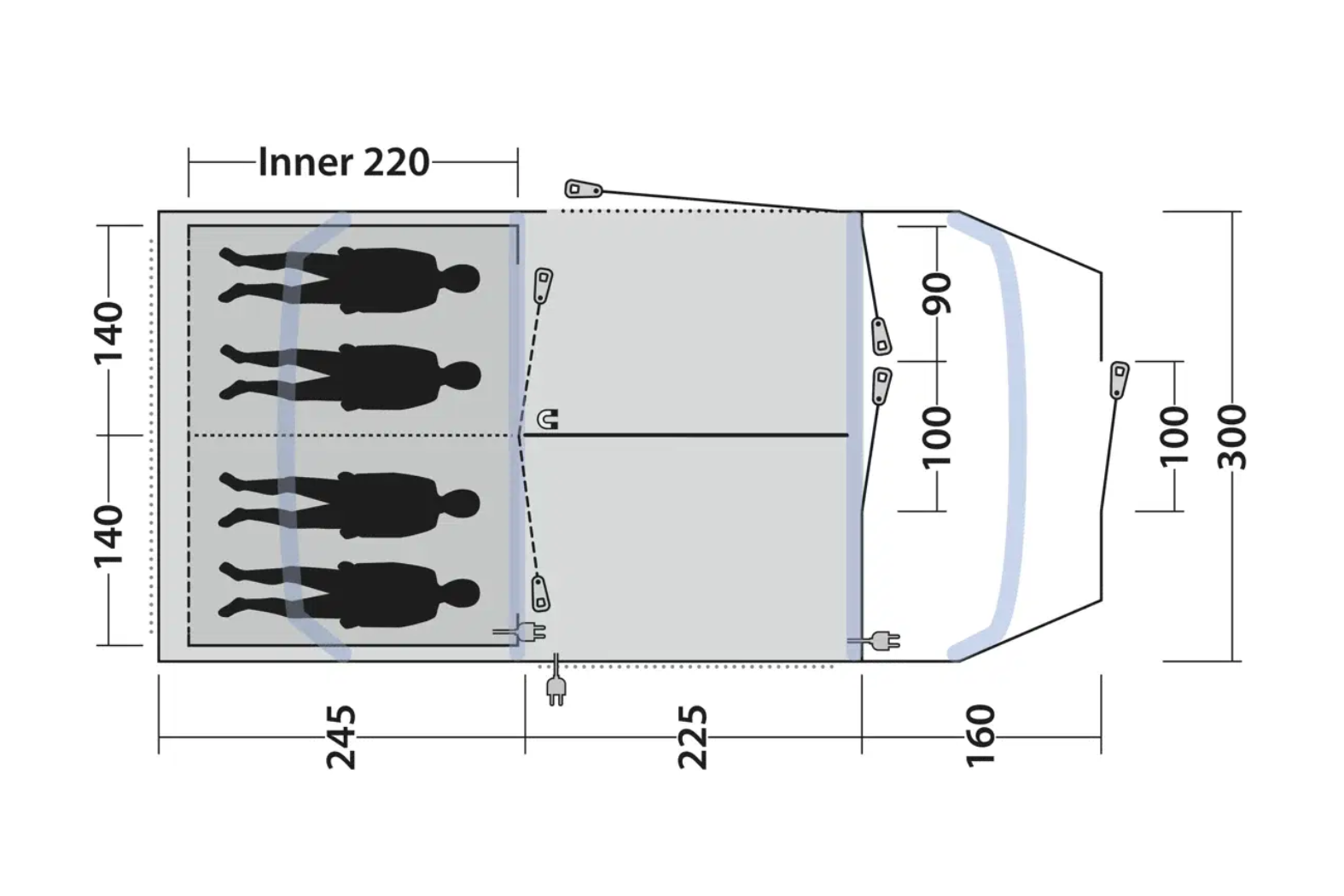 Two Dark Premier Bedrooms in the Outwell Sacramento 4 Air promote restful nights by reducing light intrusion and increasing ventilation. Moreover, mesh panels enhance airflow for a fresher sleep environment. In addition, the Rigid Air System enables fast pitching—ready to move in within 9 minutes. Furthermore, the light roof fabric adds a bright, welcoming tone during the day, and mesh storage pockets keep essentials close at hand.