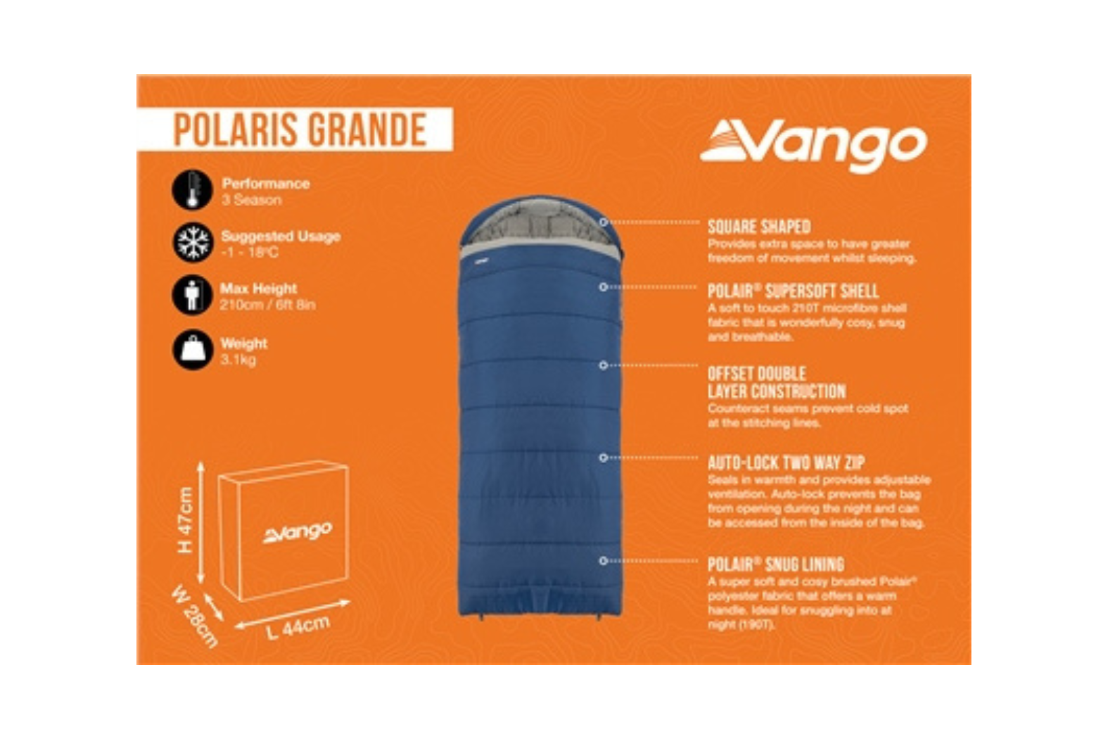 The Vango Polaris Grande 3 Season sleeping bag – Neptune delivers spacious comfort, dependable warmth and practical outdoor performance for your camping adventures. Designed to be wider and longer than a standard single sleeping bag, it gives you generous room to stretch out and relax after a day outdoors. Moreover, ThermoLock Pro insulation, combined with Grade A Quality Fill, retains heat efficiently even in slightly damp conditions. Furthermore, the soft Polair® SuperSoft shell and brushed Polair® lining provide a cosy feel that’s comfortable against the skin. In addition, practical features like a shaped hood with drawcord and auto-lock two-way zip let you balance warmth and ventilation easily as temperatures change. Whether you’re heading out for spring, summer or early autumn nights under canvas, this bag blends space, warmth and everyday usability.