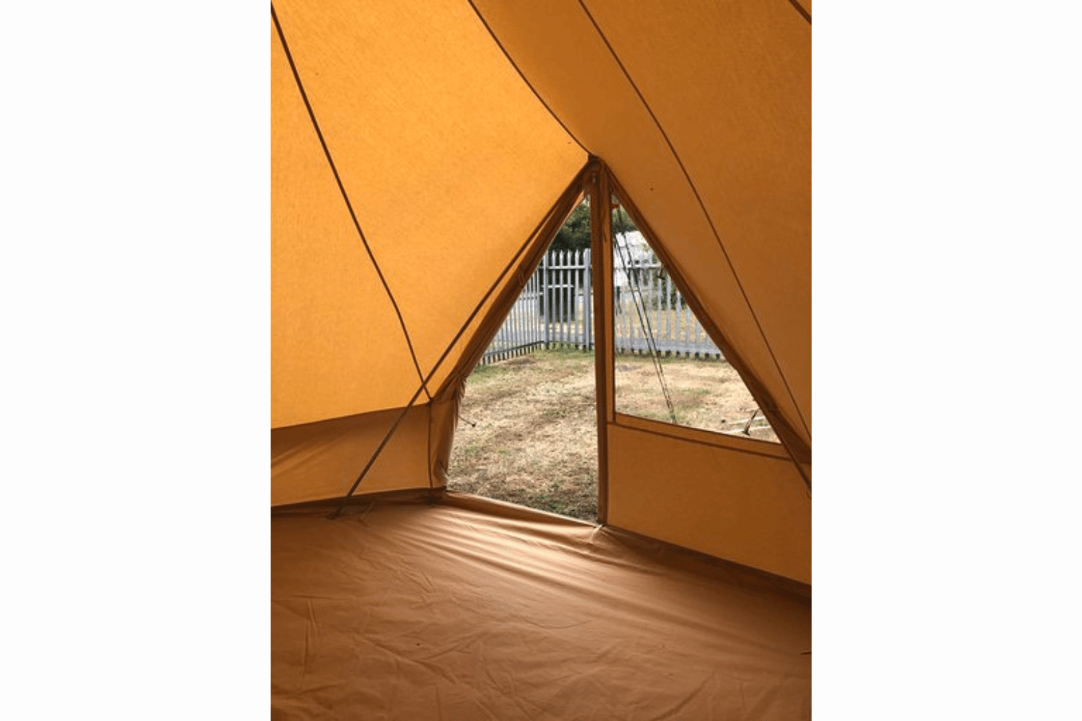 Even though the fabric is naturally breathable we have still installed ventilation panels in this bell tent. These feature the Quest No-Chill mesh which allows the air in , but stops the wind. These give you extra air flow if required, or they can all be zipped shut when you don”t want them. We also give you full ventilation doors. This means that you can roll back your doors, but keep the second internal layer zipped shut as they are full No-Chill mesh, again allowing more air flow, no wind and no insects.