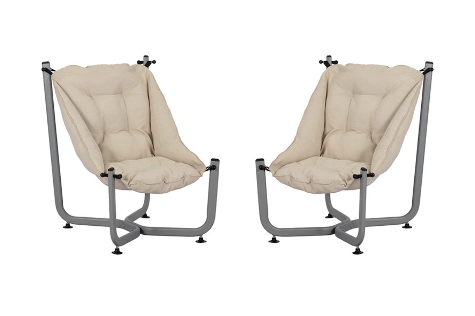 Available as a pair, these cream-colored chairs bring both style and utility to any setting. Whether placed in your garden, around a fire pit, or inside a tent, their neutral tone complements a wide range of décor. Additionally, the pair enhances shared relaxation—whether reading, conversing, or stargazing— helping make your gatherings more enjoyable.