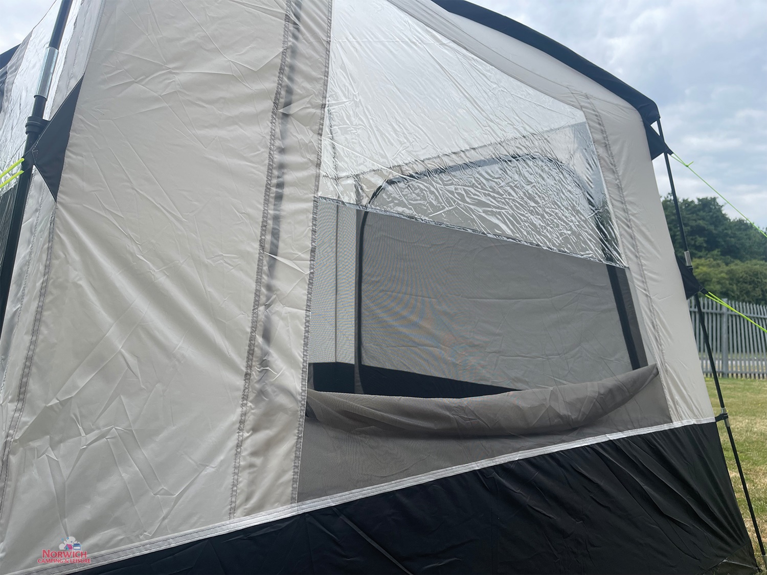on another side its a large half window and half mesh panel, on the opposite side is a blank panel, both window panels have blinds for privacy