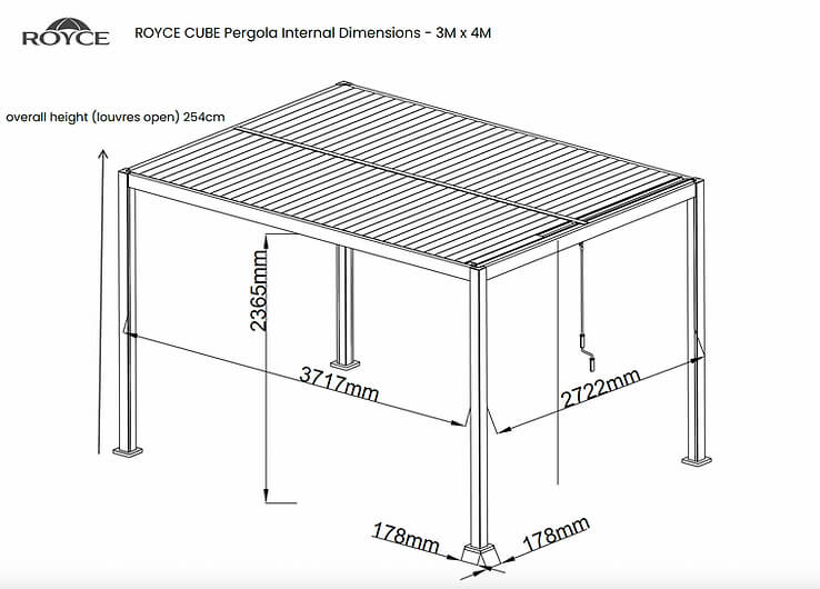 The Royce Cube Wood Look 4m x 3m Pergola actively provides versatile and stylish shade or rain shelter when you’re outdoors. By adjusting its louvre roof, you can easily choose the amount of cover you desire, from full sun to complete shade. Since the roof vanes split 50/50, you can control each half separately, ensuring everyone stays comfortable.