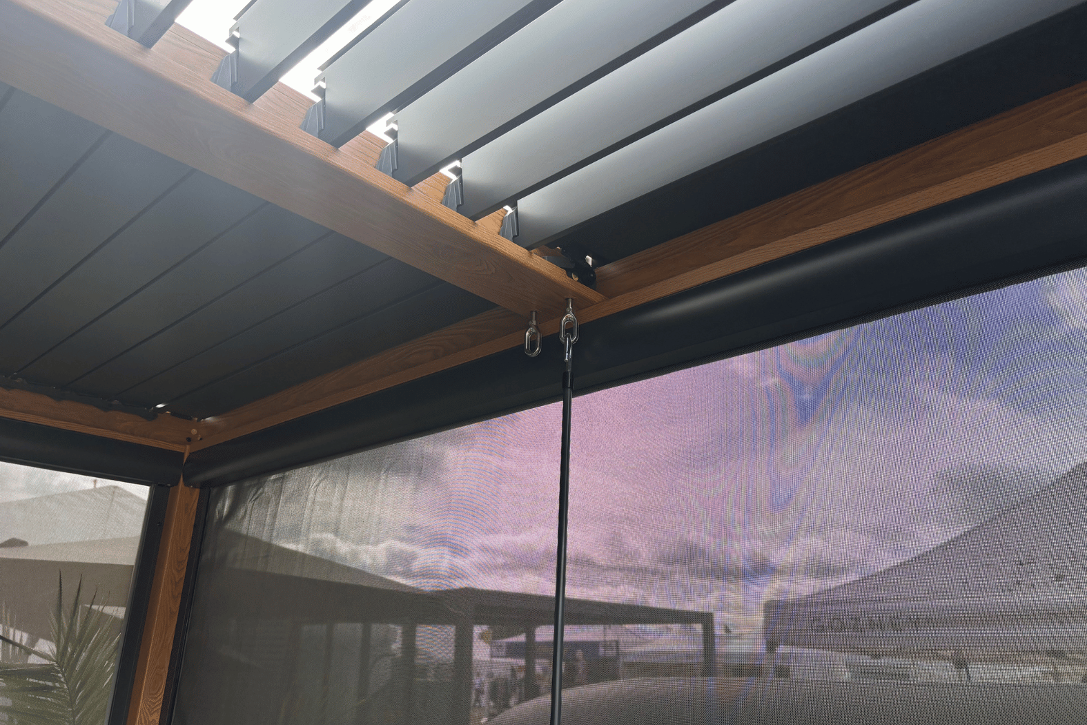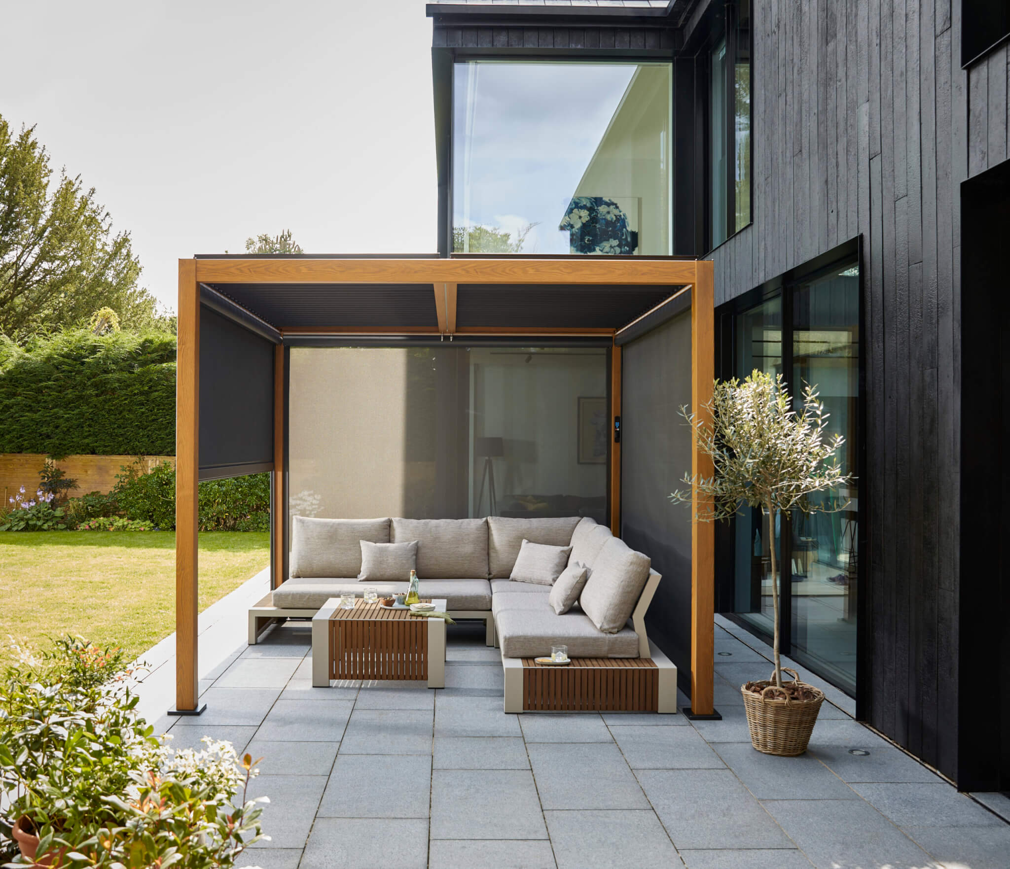 Furthermore, the Cube channels rainwater through its roof and down the hollow legs with an efficient drainage system. This improved system quickly directs water away, keeping the area drip-free even after a shower. For added privacy, optional side screens can be rolled down to create a cosy feel or up for a more open atmosphere.