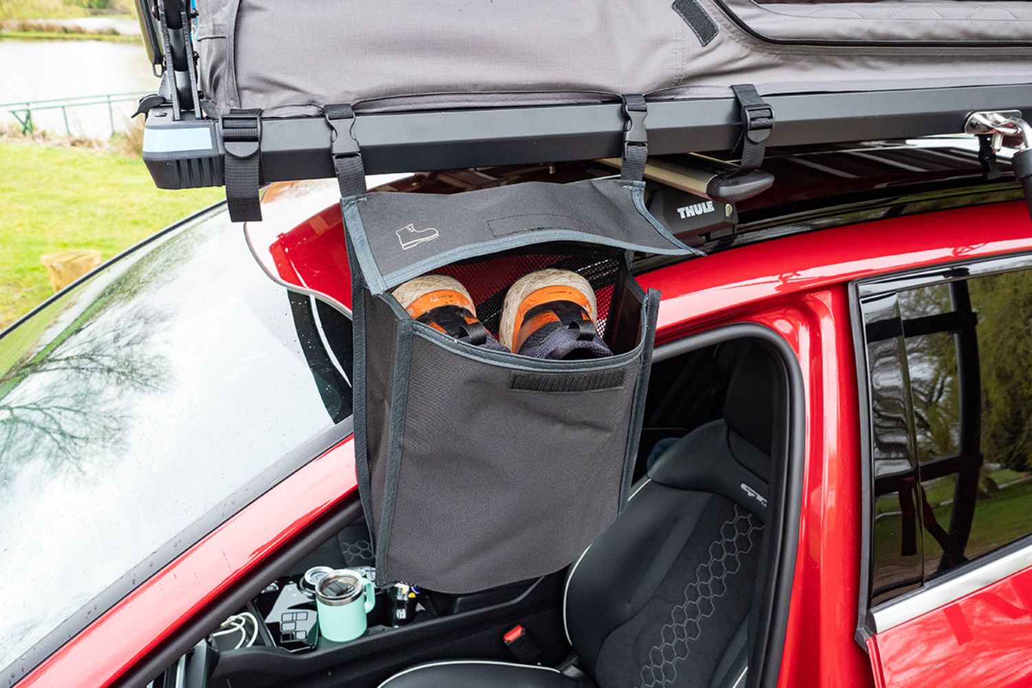 The 5cm high-density foam mattress is soft and cosy, with a skin-friendly thermal cover that offers a comfortable sleeping experience. Includes two shoe pockets and two inner mesh pockets for storing small items like keys and devices. There is even a sewn-in dimmable LED strip inside the roof tent for added convenience!