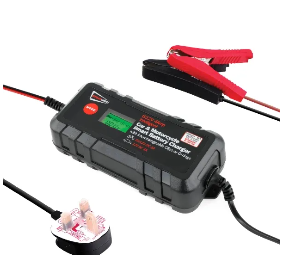 This smart charger can charge both 6V and 12V batteries at a maximum charge power of 4 Amps.