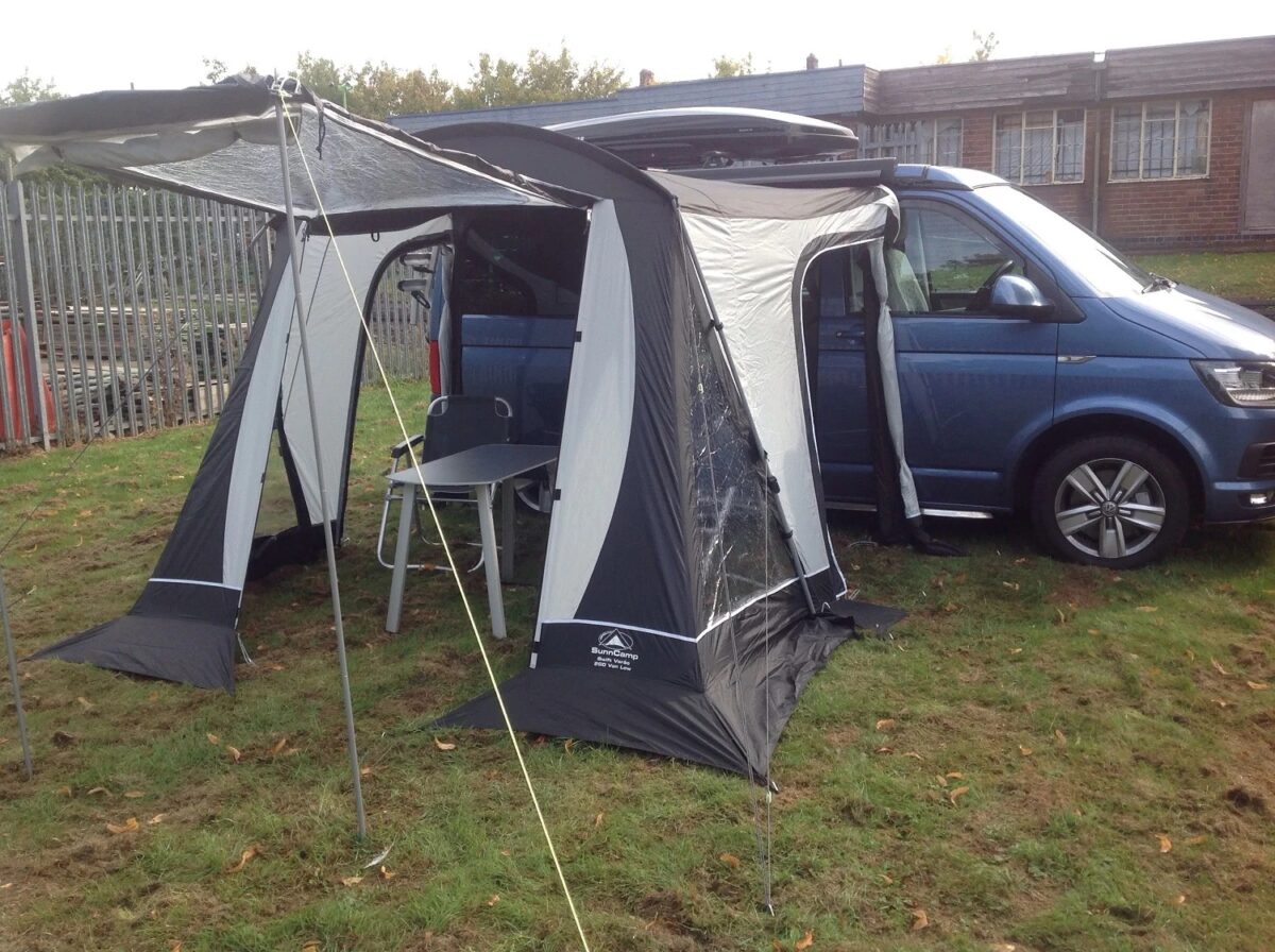 The enclosed front and side doors provide privacy and convenient access, while external peggable mud walls enhance protection against wind and rain. Curtains on all windows allow for controlled light, maintaining comfort and privacy. Ideal for campervans, VW T5/T6, Vauxhall Vivaro, Renault Trafic, and other vehicles within the 185–200cm height range, this awning ensures a secure, comfortable space wherever you go.