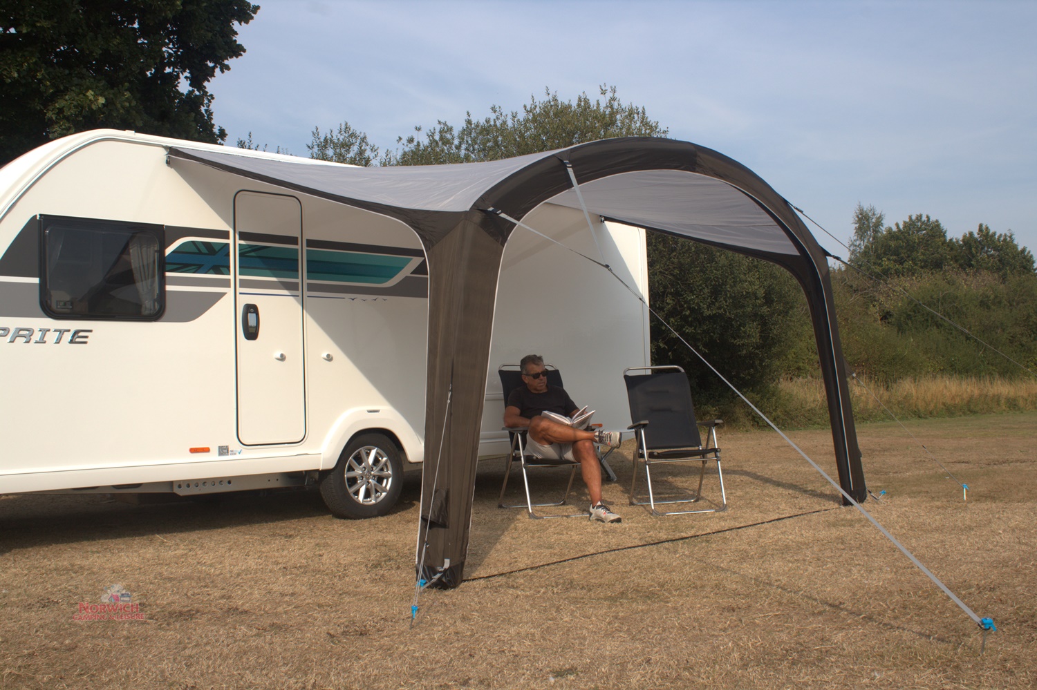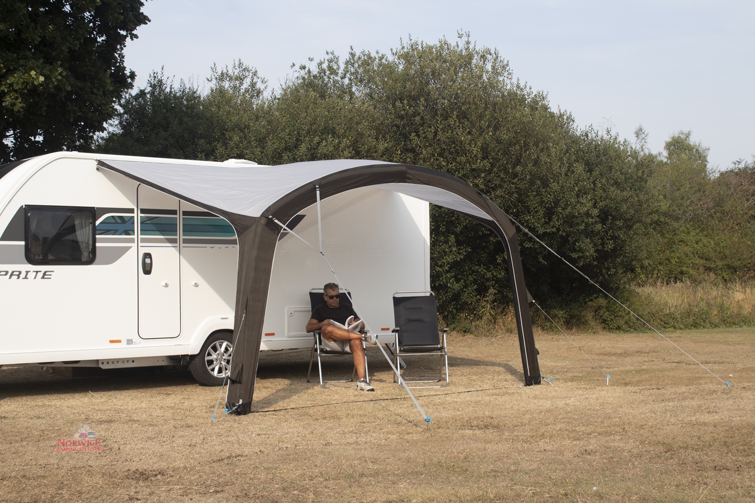 Setting up your oasis is a breeze with simple fixing to your caravan and the single inflation point feature, streamlining the process for a hassle-free experience. The package includes a manual pump, pegs for secure anchoring, and a sleek carry bag, making transportation and storage effortlessly convenient.