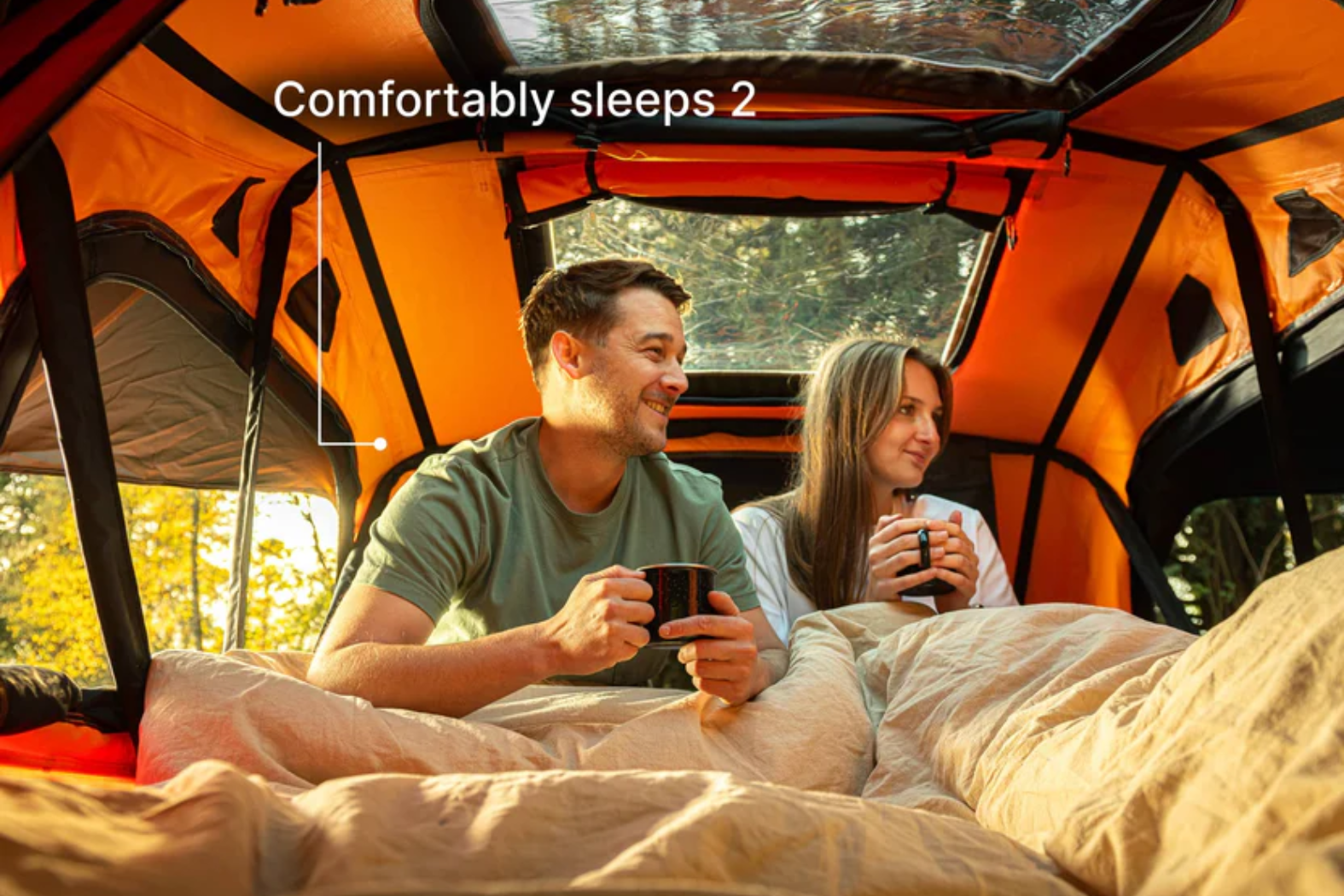 The TentBox Lite Roof Tent is designed for two people, offering a comfortable sleeping space with a built-in mattress. Despite its compact size, it still provides enough room to sit up and relax.
