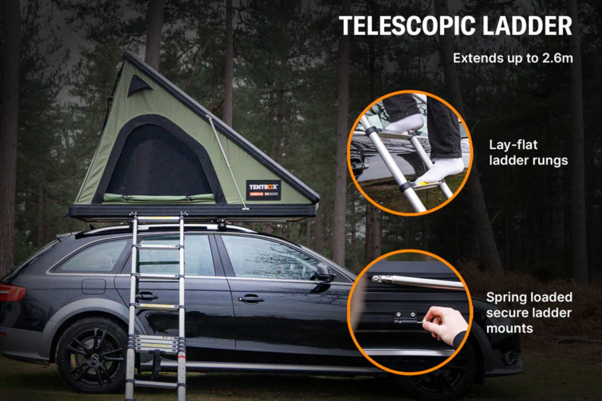 - Ladder: Telescopic, with spring-loaded brackets and ‘lay-flat’ comfort rungs