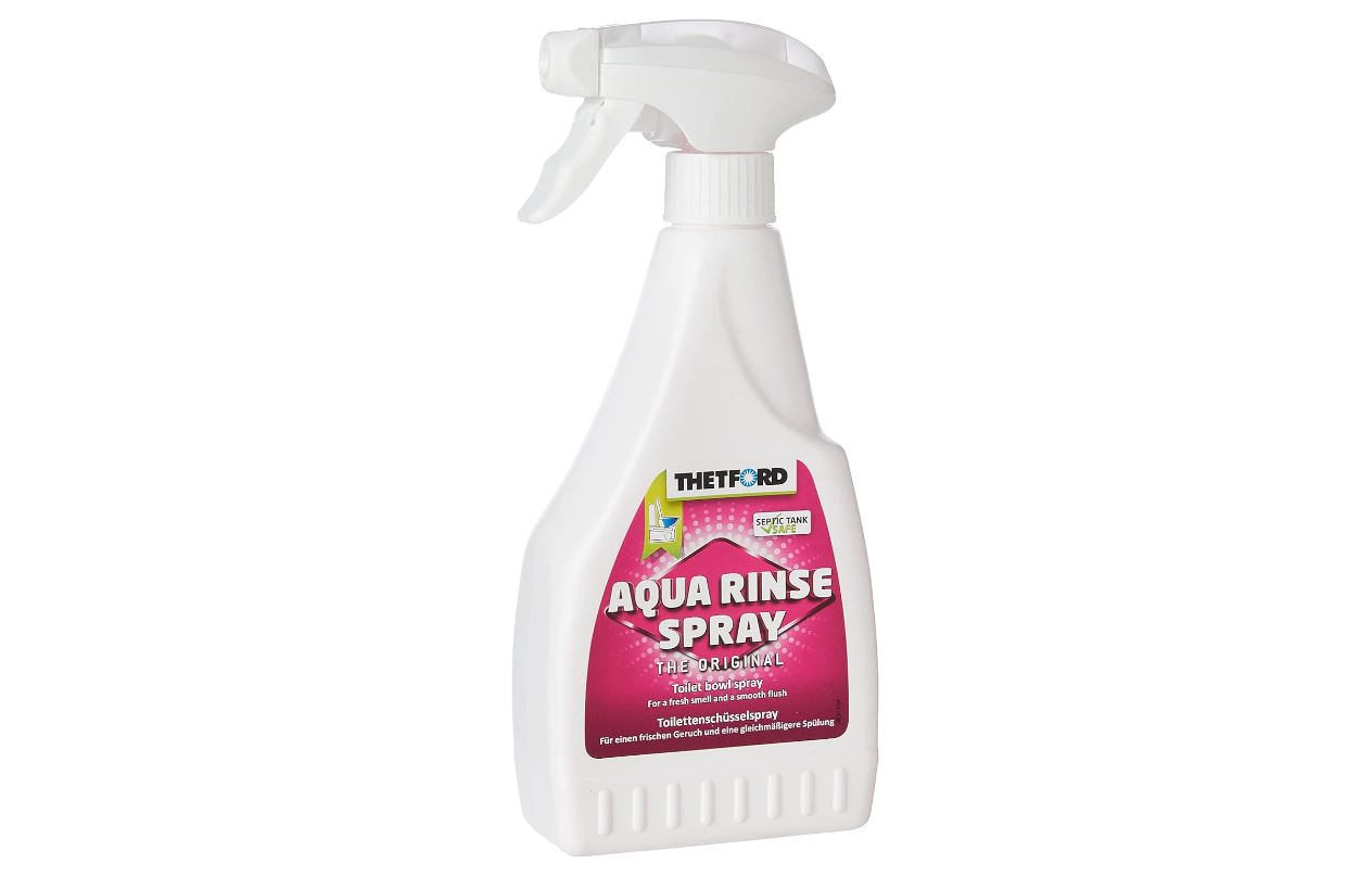 Product Description A brand new product for the 2015 season from Thetford. Aqua Rinse Spray is a specially formulated version of Aqua Rinse Plus for toilets that do not have their own flush tank – i.e. toilets that are connected to a central water tank. This product has all the benefits of Aqua Rinse Plus but can be safely sprayed in to your toilet, rather than being added to the flush tank. Features Septic tank safe (Test ISO 11734) Coats the toilet bowl with a protective layer for a smoother flush Lubricates and maintains toilet seals Keeps the toilet fresh smelling long after spraying Saves water as fewer flushes are required Important: do not re-fill the bottle with Aqua Rinse Plus (as that product is not designed to be sprayed)