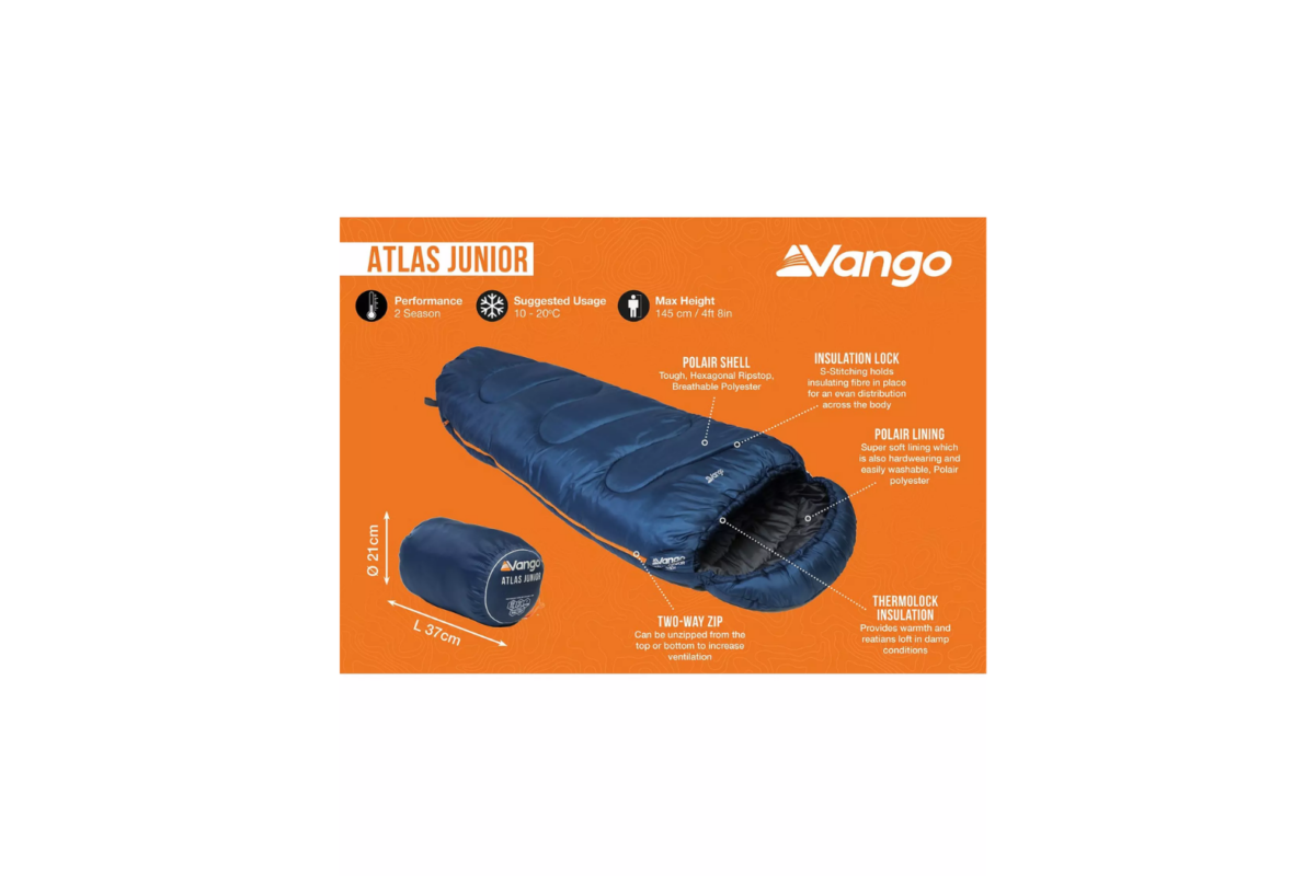 The Vango Atlas Junior 2 Season sleeping bag is a dependable first camping bag, explicitly designed for kids and smaller campers. Its mummy sleeping bag shape tapers from the shoulders to the feet, increasing thermal efficiency and reducing pack size. Moreover, ThermoLock insulation with Grade A Quality Fill traps warmth evenly throughout the bag while remaining lightweight and easy to carry. Furthermore, the soft Polair® shell and brushed Polair® lining deliver a cosy, comfortable feel that’s ideal for spring and summer nights. In addition, thoughtful details such as a two-way zip, hanging loops and a drawcord stuff sack make it practical and easy to use on family trips, sleepovers and school camps. Whether your child is heading out on their first outdoor adventure or joining a youth group trip, the Atlas Junior delivers reliable comfort and practical features night after night.