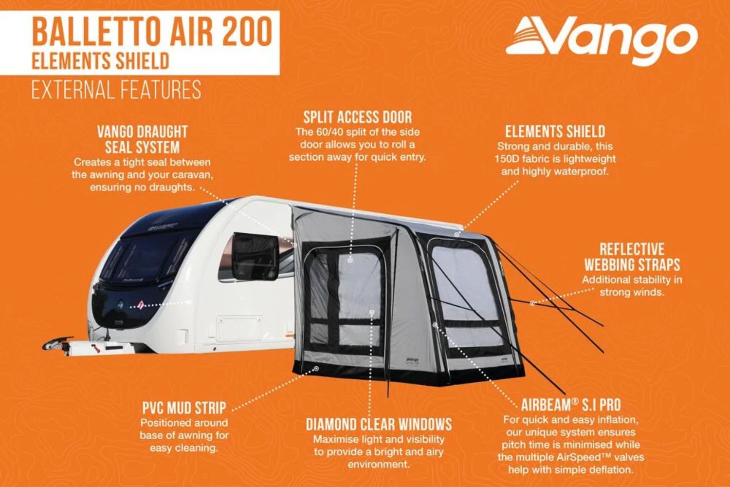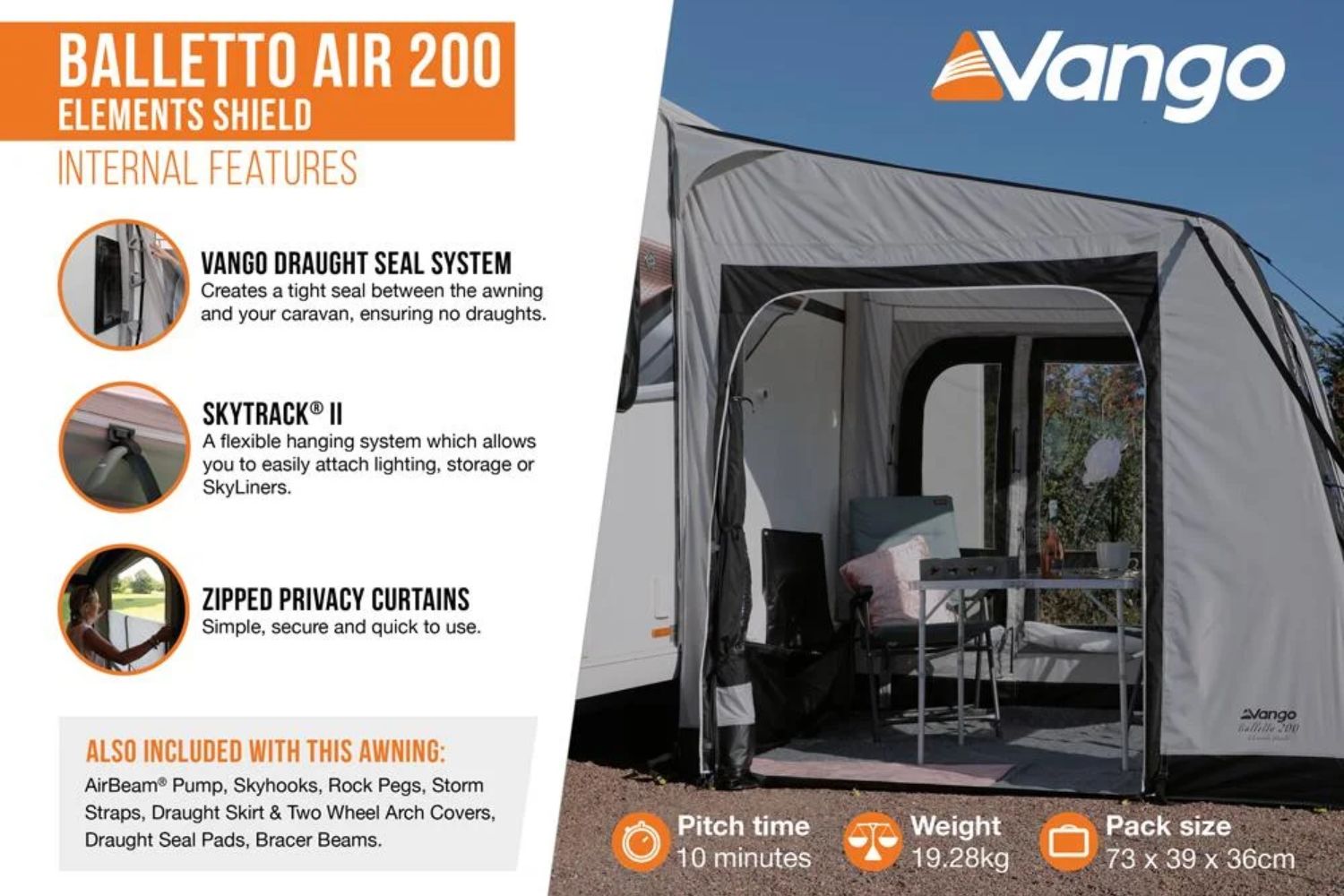 The Vango Balletto Air 200 Elements Shield Awning, equipped with Vango’s ground-breaking AirBeam® Single Point Inflation and Multi-Point Deflation, is the ideal campsite retreat. It pitches and packs up incredibly quickly, giving you more time to enjoy your holiday.
