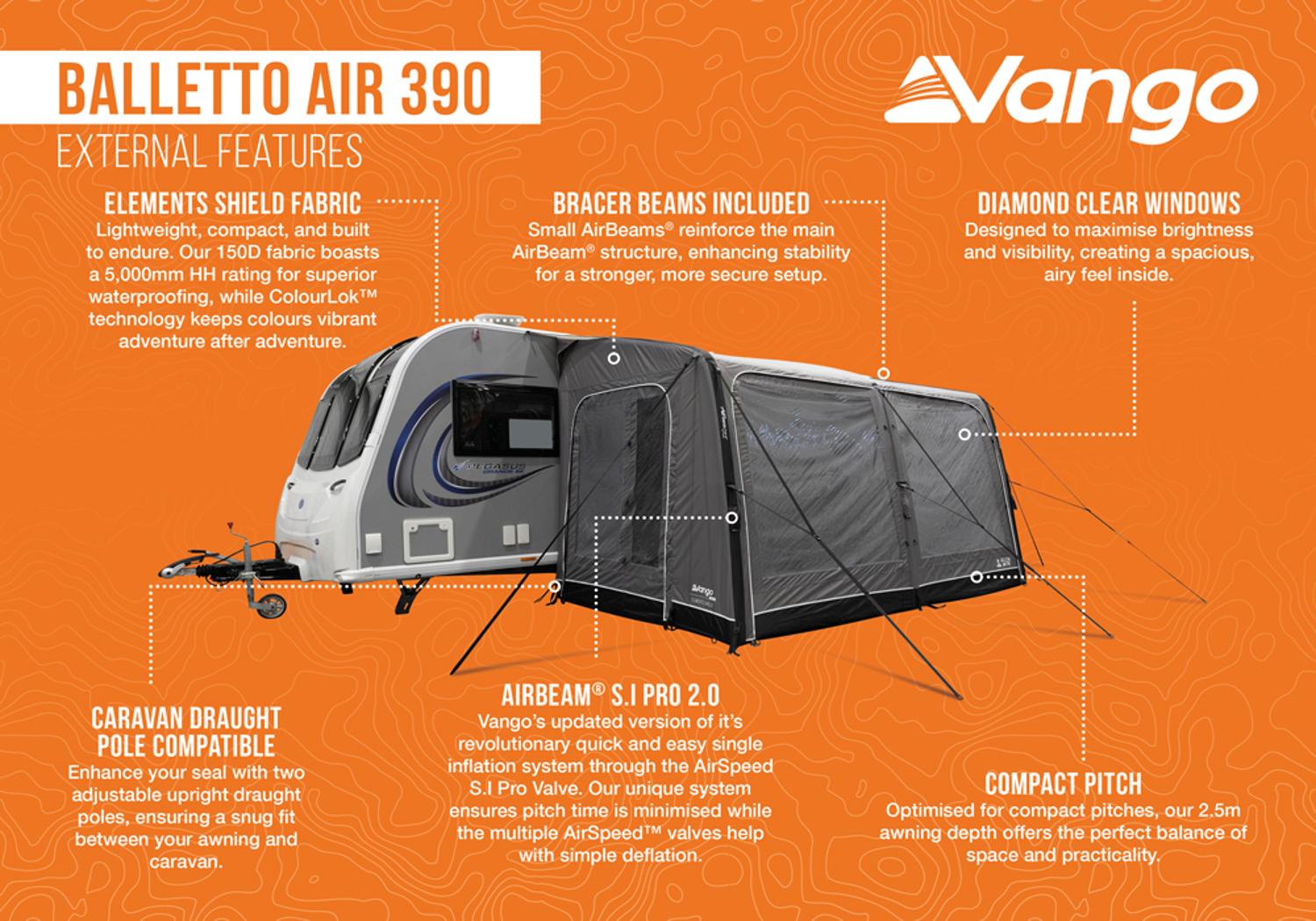 Elevate your caravan living space with the Vango Balletto Air 390, an advanced inflatable awning that blends convenience, comfort, and contemporary design. Built to perform across all seasons, this premium awning provides generous space and dependable weather protection — ideal for both quick weekend escapes and long touring adventures. Furthermore, its stylish appearance and technical build quality make it a reliable and elegant addition to your caravan setup.