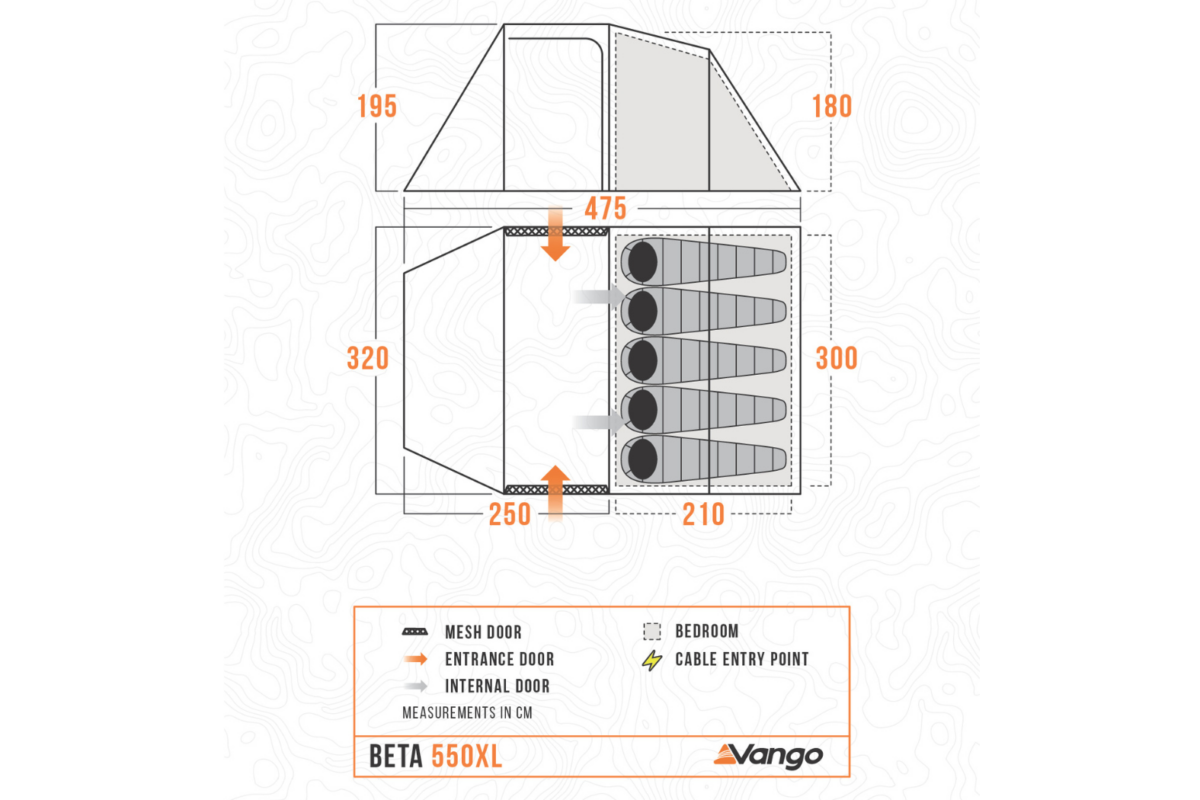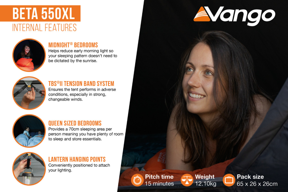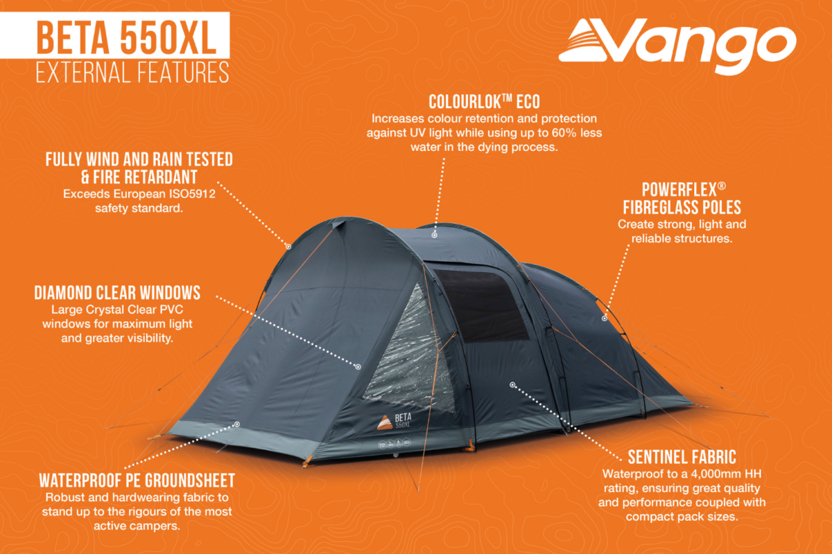 The Beta 550XL uses Sentinel / Dynamic Weave 100™ polyester fabric, designed for strength and long-lasting weather resistance. Furthermore, its 4,000 mm hydrostatic head (HH) waterproof rating and fully taped seams help keep the interior dry even during extended rainfall. In addition, the ColourLok Eco™ treatment improves UV resistance, which helps maintain fabric colour over time. Meanwhile, the linked-in waterproof PE groundsheet provides added defence against draughts and insects. Consequently, you can camp confidently across three seasons without worrying about unpredictable weather.