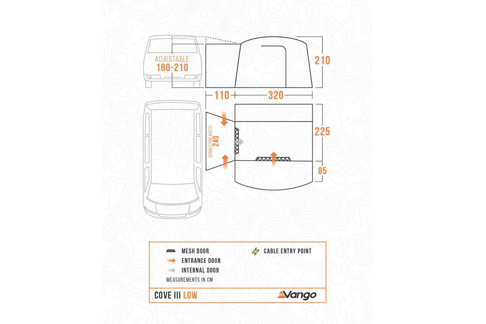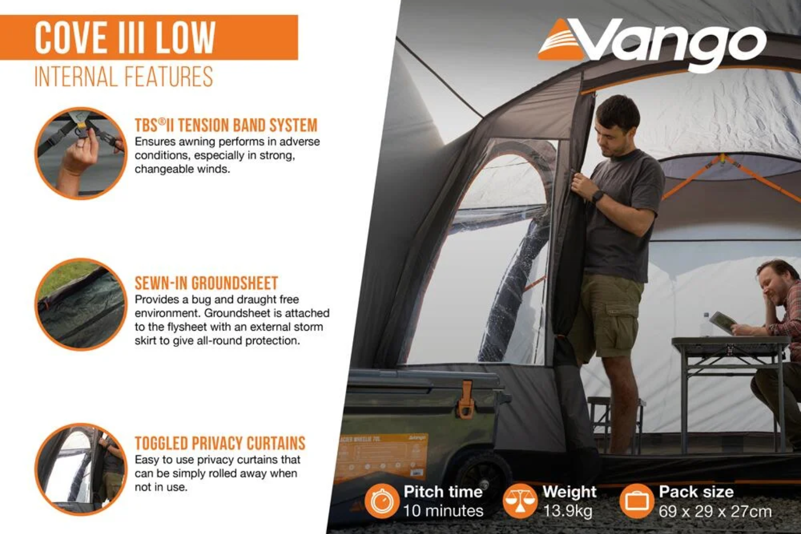 Specification Details Model Vango Cove III Low Poled Awning (2026 Edition) Connection Height 180 – 210 cm (Low) Frame PowerFlex® fibreglass poles Fabric Sentinel Active 150D Polyester with ColourLok™ Eco Waterproof Rating 4,000 mm HH Dimensions (W × L) 320 cm × 310 cm (plus tunnel) Pack Size 80 × 41 × 41 cm (approx.) Weight Approx. 16 kg Pitch Time Around 12–15 minutes Groundsheet Sewn-in polyethylene