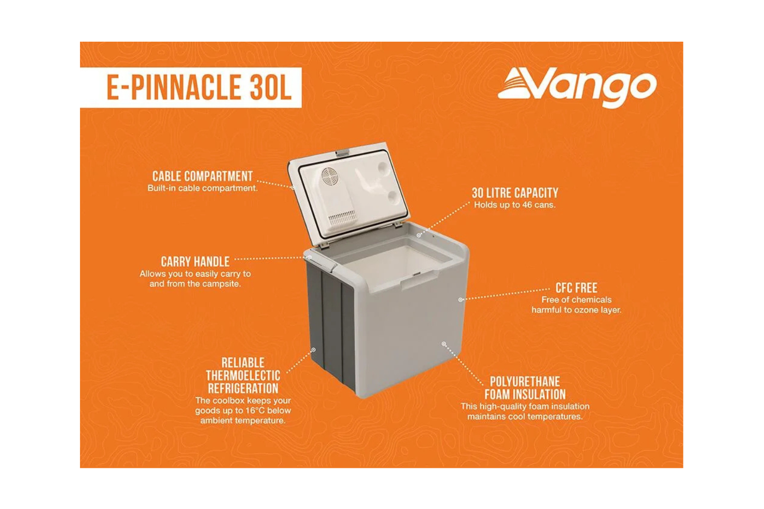 The Vango E-Pinnacle 30L Mains and 12V Electric Coolbox can be powered either from AC-230V mains or by a DC – 12V in-car socket. The coolbox is able to cool up to 20 degrees C below the ambient temperature, ensuring that your food and drink supplies are kept cool even on a warm day.