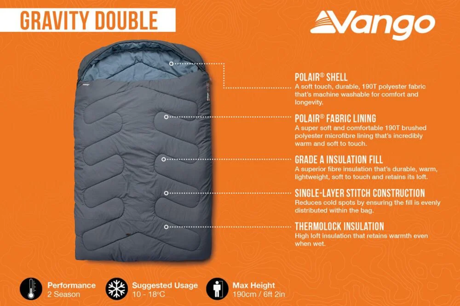Share cosy nights outdoors with the Vango Gravity Double 2 Season sleeping bag, designed for couples, friends or family camping trips. Moreover, this versatile double sleeping bag can also unzip into two single sleeping bags when needed, giving you flexible sleep options for changing conditions. Furthermore, its Grade A quality fill with ThermoLock insulation traps warmth effectively and retains loft even if damp. In addition, the super-soft brushed Polair® lining feels comfortable against your skin, while the durable Polair® polyester shell stands up to repeated use on trips and festivals. With its roomy square shape and practical details, this bag offers reliable comfort and performance for spring, summer and early autumn camping.