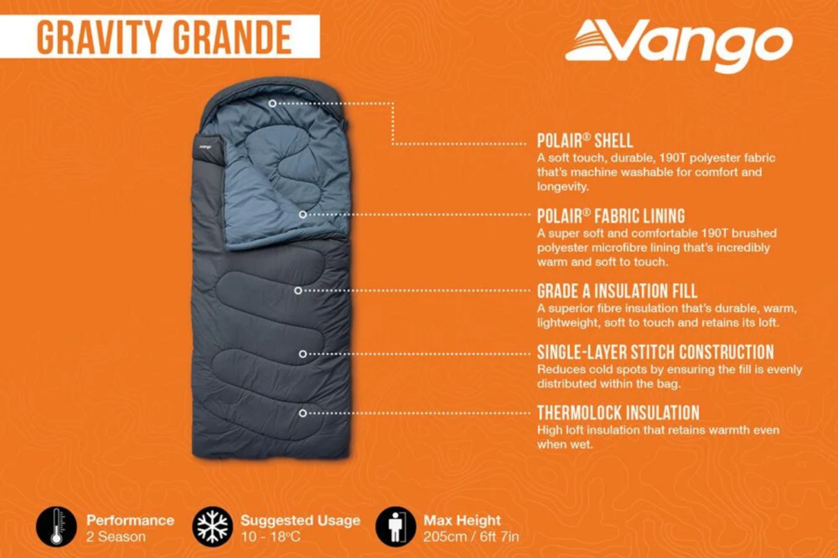 The Vango Gravity Grande 2 Season sleeping bag is designed for comfortable nights in spring and summer conditions. Moreover, the ThermoLock insulation, with its square shape, reduces cold spots and maintains even warmth throughout the bag. In addition, the shaped hood with drawcord minimises heat loss around the head. Furthermore, the two-way zip lets you open the bag from either end to manage airflow and comfort.