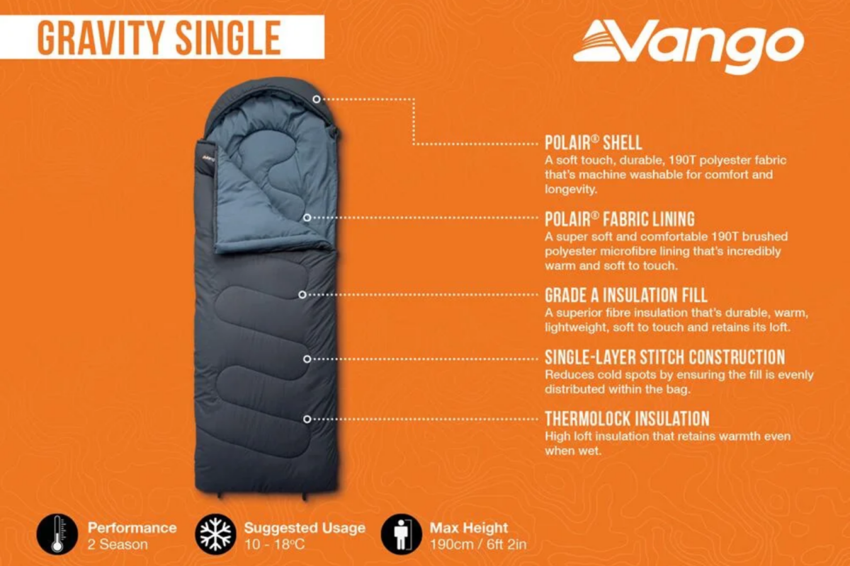 The Vango Gravity Single 2 Season sleeping bag delivers dependable warmth and comfort for spring and summer camping trips without breaking the bank. Designed with a square sleeping bag shape, it gives extra room to move at night and avoids the restriction of tapered designs. Moreover, Grade A ThermoLock insulation traps heat and retains loft — even if conditions turn damp. Furthermore, the soft Polair® shell and brushed lining feel gentle against your skin while staying durable and machine washable for easy care. In addition, practical touches like a shaped hood with a drawcord and a two-way zip help you manage ventilation as temperatures change. Whether you’re festival camping, heading out for a weekend break, or enjoying a simple overnight under canvas, the Gravity Single provides reliable comfort on every trip.