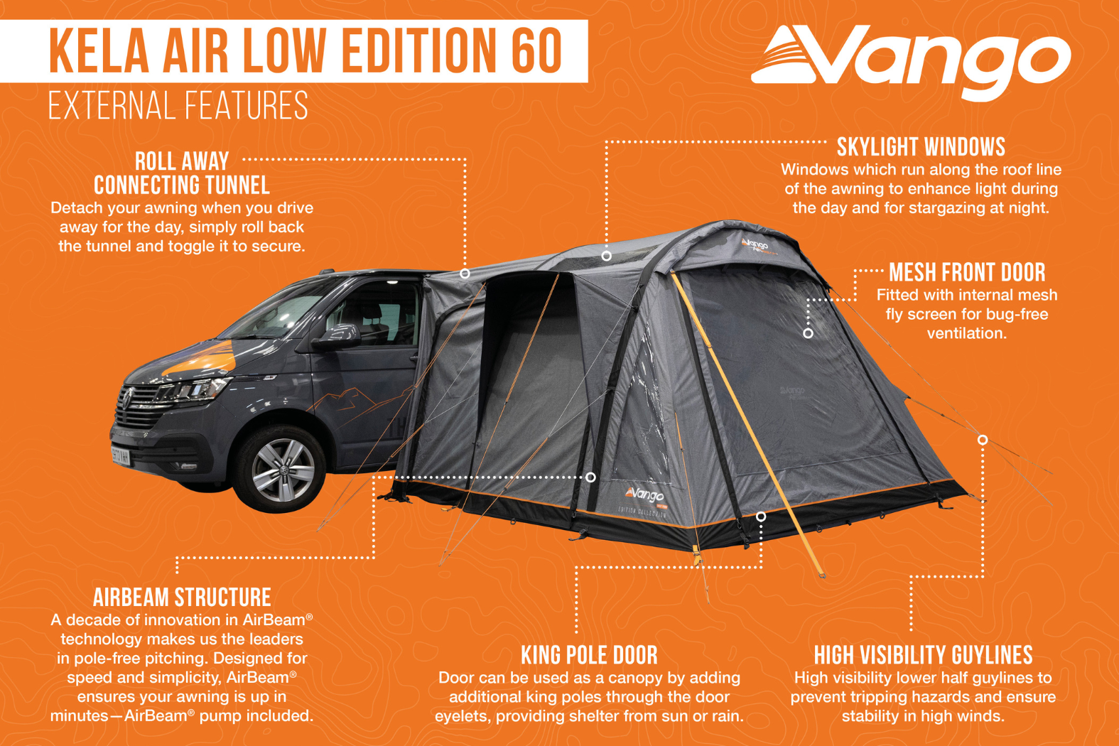 The Vango Kela Air Low Edition 60 Drive Away Awning is a limited-edition version of the popular Kela Air Low, built to expand your campervan living space with premium materials and refined touring features. Designed for vehicles between 180–210cm in height, it combines fast AirBeam® pitching with durable Dynamic Weave™ fabric. As a result, this Vango drive away awning delivers dependable shelter, flexibility, and comfort for extended trips and shorter breaks alike.