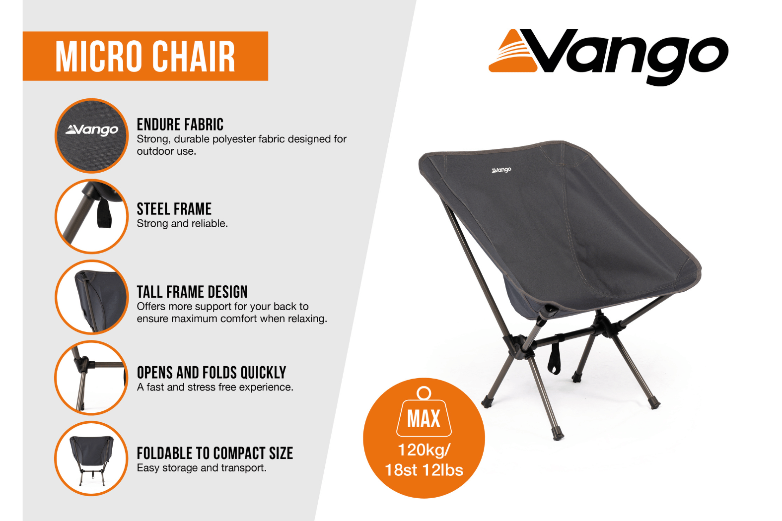 - Ultra-light Vango Micro Camping Chair ideal for compact pack setups