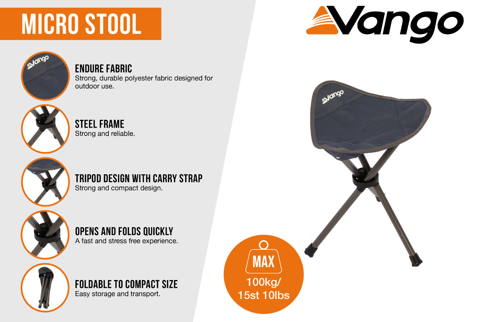 The Vango Micro Folding Outdoor Footstool is a compact and lightweight seating solution designed for camping, fishing, festivals and relaxed outdoor breaks. Built with a simple tripod structure, this footstool provides stable support without the bulk of a full chair, making it ideal when space and weight matter. Moreover, the durable steel frame delivers reliable strength, while the Endure fabric offers comfort and resilience outdoors. Furthermore, the integrated carry strap makes transport effortless, allowing you to move easily between pitches or rest spots.