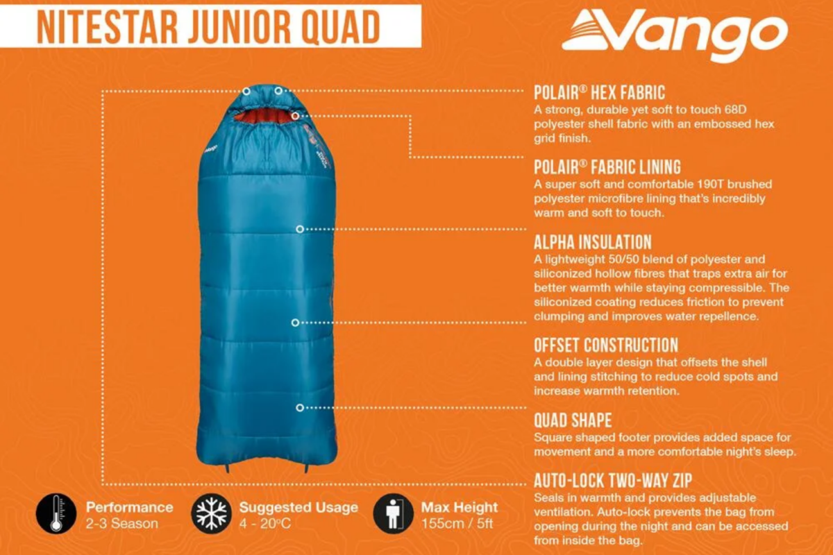 The Vango Nitestar Alpha Junior Quad sleeping bag gives young adventurers the warmth and freedom they need on spring, summer and early autumn trips. This junior model features Vango’s award-winning Insulite Alpha insulation, which balances excellent warmth with impressive compressibility for easy packing. Moreover, the quad square shape provides generous internal space, so kids don’t feel restricted while they sleep under canvas or the open sky. Furthermore, the robust Polair® Hex shell and soft Polair® lining make this sleeping bag both comfortable and durable. In addition, practical anti-snag zip features and hanging loops make setup and care simple. Whether it’s a family holiday or a youth group weekend, this junior bag delivers dependable comfort night after night.