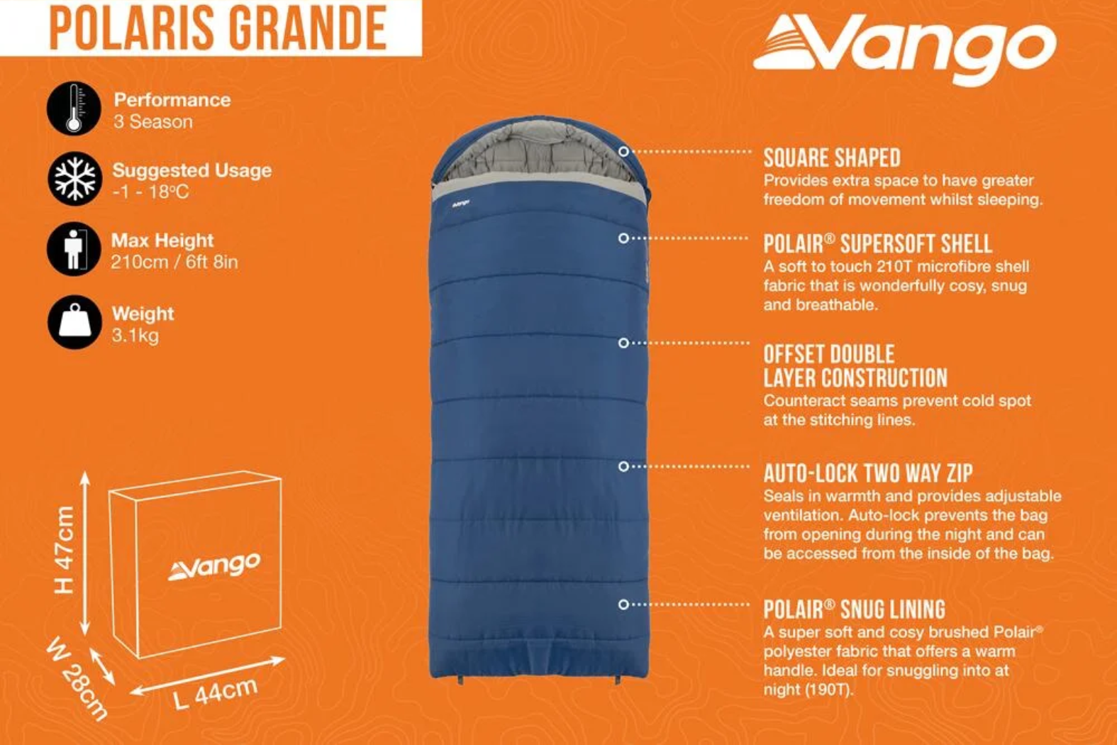 The Vango Polaris Grande 3 Season sleeping bag – Neptune delivers spacious comfort, dependable warmth and practical outdoor performance for your camping adventures. Designed to be wider and longer than a standard single sleeping bag, it gives you generous room to stretch out and relax after a day outdoors. Moreover, ThermoLock Pro insulation, combined with Grade A Quality Fill, retains heat efficiently even in slightly damp conditions. Furthermore, the soft Polair® SuperSoft shell and brushed Polair® lining provide a cosy feel that’s comfortable against the skin. In addition, practical features like a shaped hood with drawcord and auto-lock two-way zip let you balance warmth and ventilation easily as temperatures change. Whether you’re heading out for spring, summer or early autumn nights under canvas, this bag blends space, warmth and everyday usability.