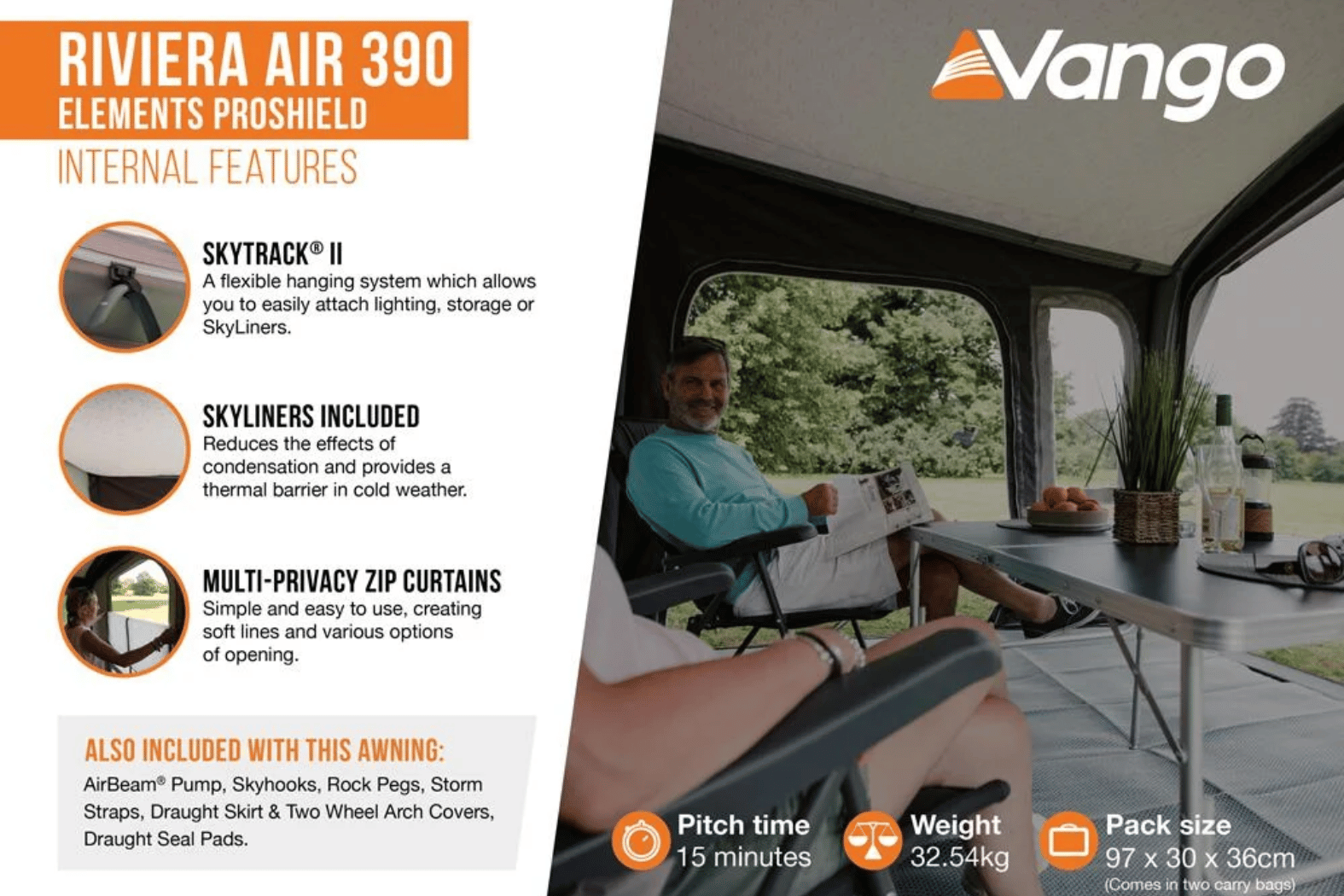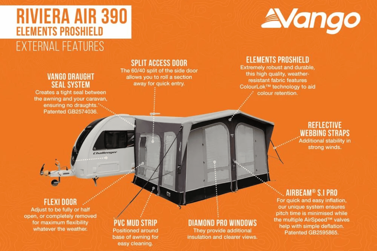 Elevate your caravanning experience with the Vango Riviera Air 390 Elements ProShield Awning, crafted for comfort, durability and quick setup. This inflatable porch awning blends timeless style with modern performance. Moreover, the advanced AirBeam® S.I Pro single-point inflation system delivers fast pitching. In addition, the robust Elements ProShield fabric ensures long-lasting weather resistance. Whether on a weekend break or an extended tour, this awning gives you premium living space and peace of mind.