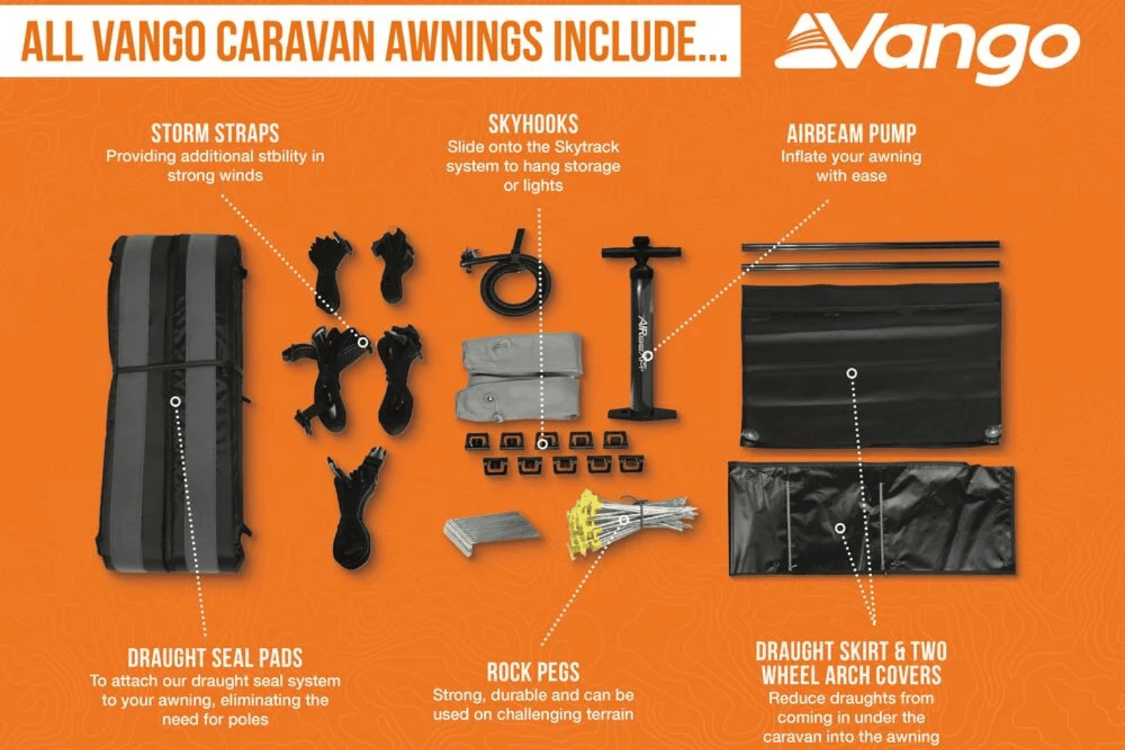 Includes Draught skirt, wheel-arch covers, pump, storm straps, pegs