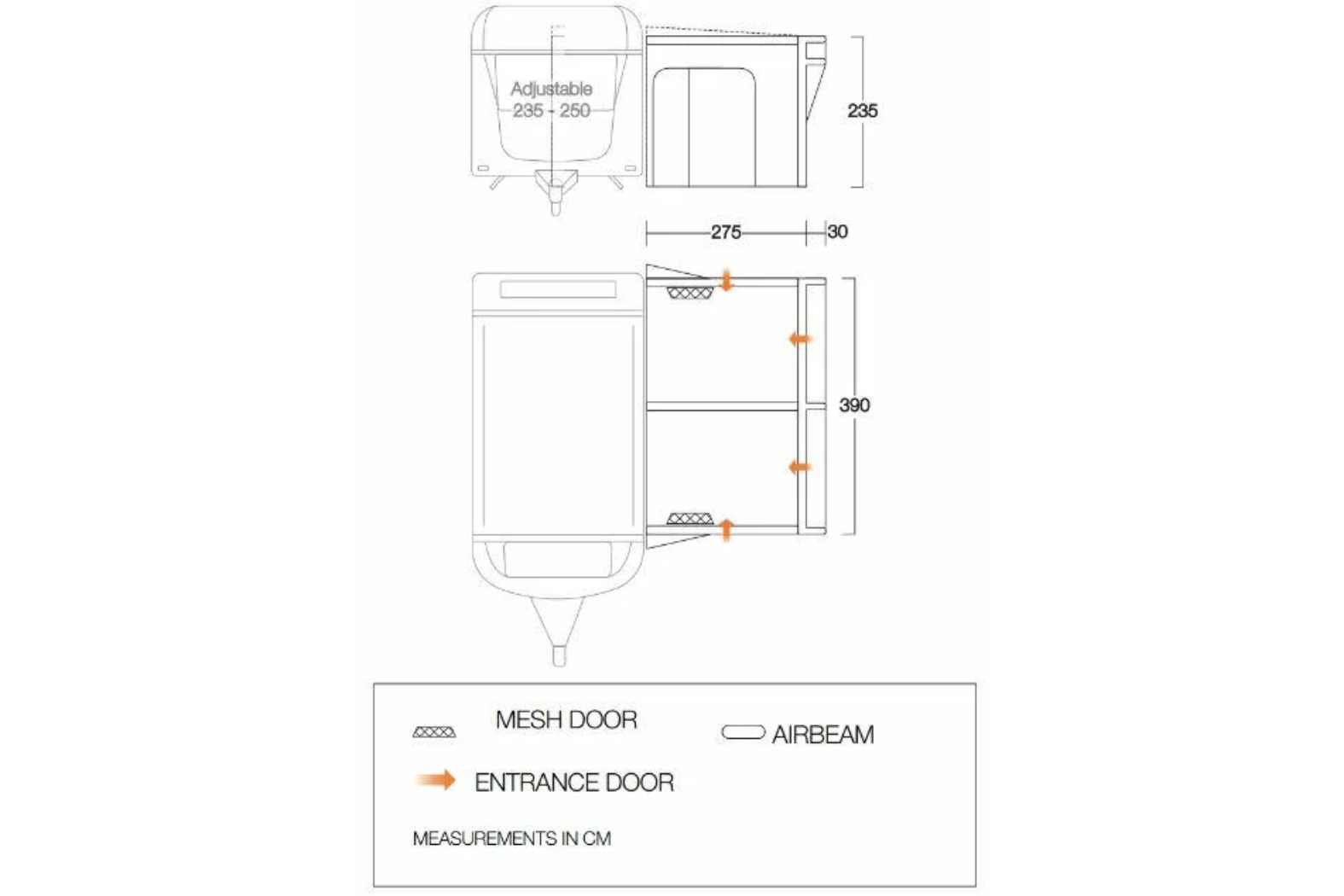 With a width of 390 cm and depth of 275 cm this awning provides generous space for relaxing and dining. The draught-seal system and included wheel-arch covers guard against cold air.The flexi-door, combined with a 60/40 split access door and PVC mud strip, offers flexible entry and practical cleaning.