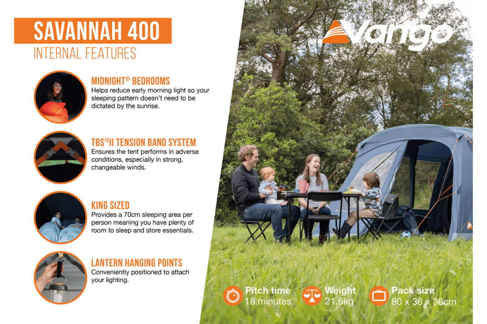 The Vango Savannah 400 Poled Tent combines spacious, family-friendly design with reliable weather protection and straightforward setup. It offers separate sleeping and living zones, plenty of head-height and a generous awning — ideal for families, couples with pets, or small groups on camping trips. Moreover, the fully sewn-in groundsheet and robust materials provide peace of mind in varied weather. In addition, the included footprint protector helps extend the tent’s lifespan. Furthermore, its thoughtful layout and clever features make it an excellent choice for festivals, weekend getaways or longer summer holidays.