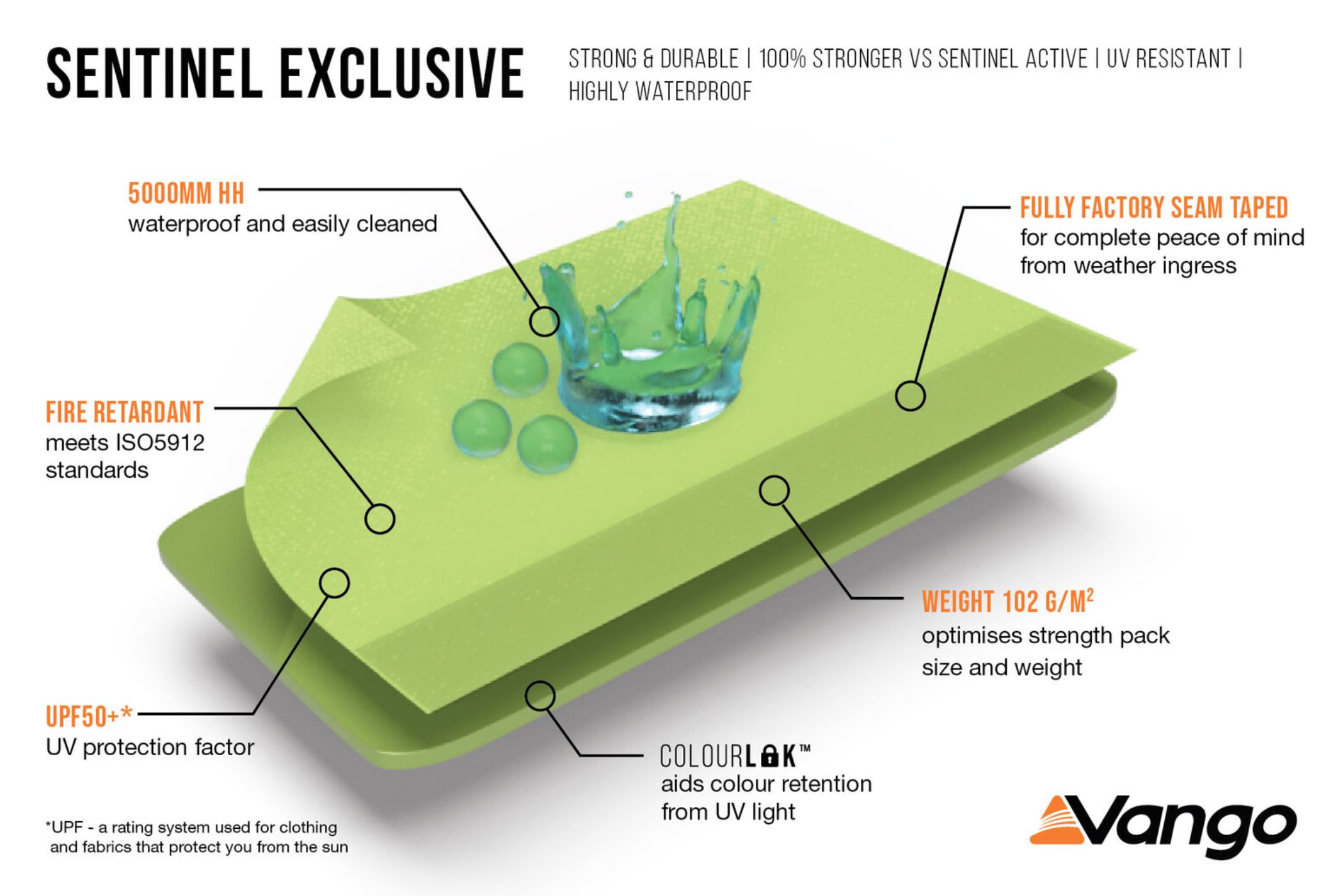 - Sentinel Exclusive fabric; 5,000 mm HH with ColourLok™