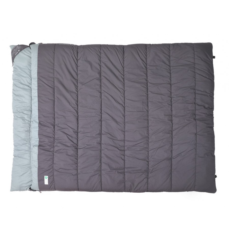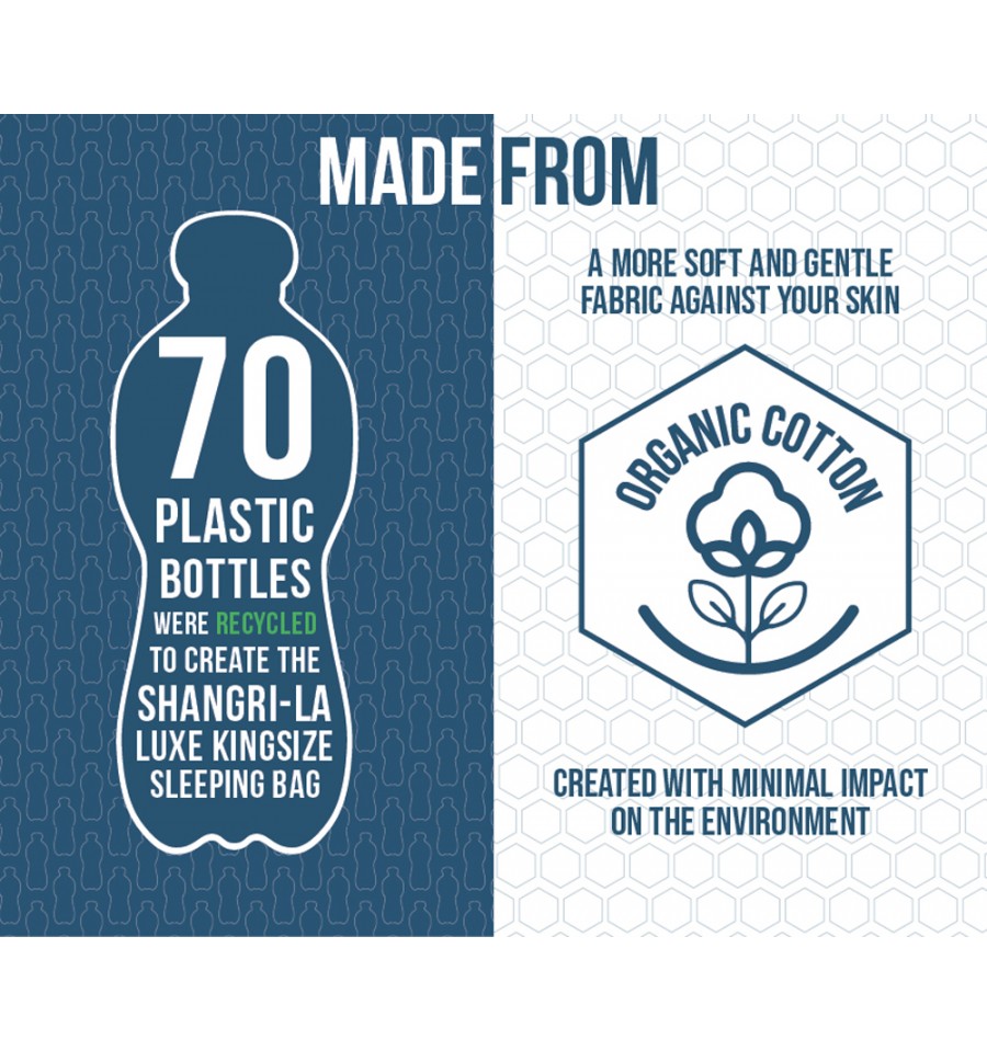 The Vango Shangri-La Collection has expanded into this beautiful new range of luxury sleeping bags to complement our award-winning Shangri-la mats for the ultimate night’s sleep. As part of our Earth Collection, the bag has been made using organic cotton and 100% recycled polyester, making it a more sustainable choice. This square shaped, kingsize sleeping bag with integrated headrest provides the extra space and comfort you need for the perfect sleep and the brushed organic cotton is hypo-allergenic and feels soft on your skin, much like your cosy winter bedding at home, soft, comfortable and warm to touch on a cold night. One of the unique features about this back is its versatility as the bag can be separated fully to form two individual bags or two blankets. It’s also machine washable at 30 degrees and comes in a compression carry bag for a smaller pack size and for easy storage. Sleep like royalty on your camping or campervan trips and use for everyday use when you have family of friends over to stay.