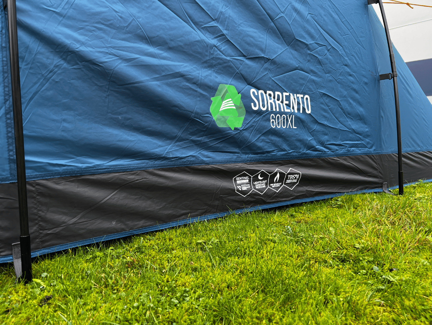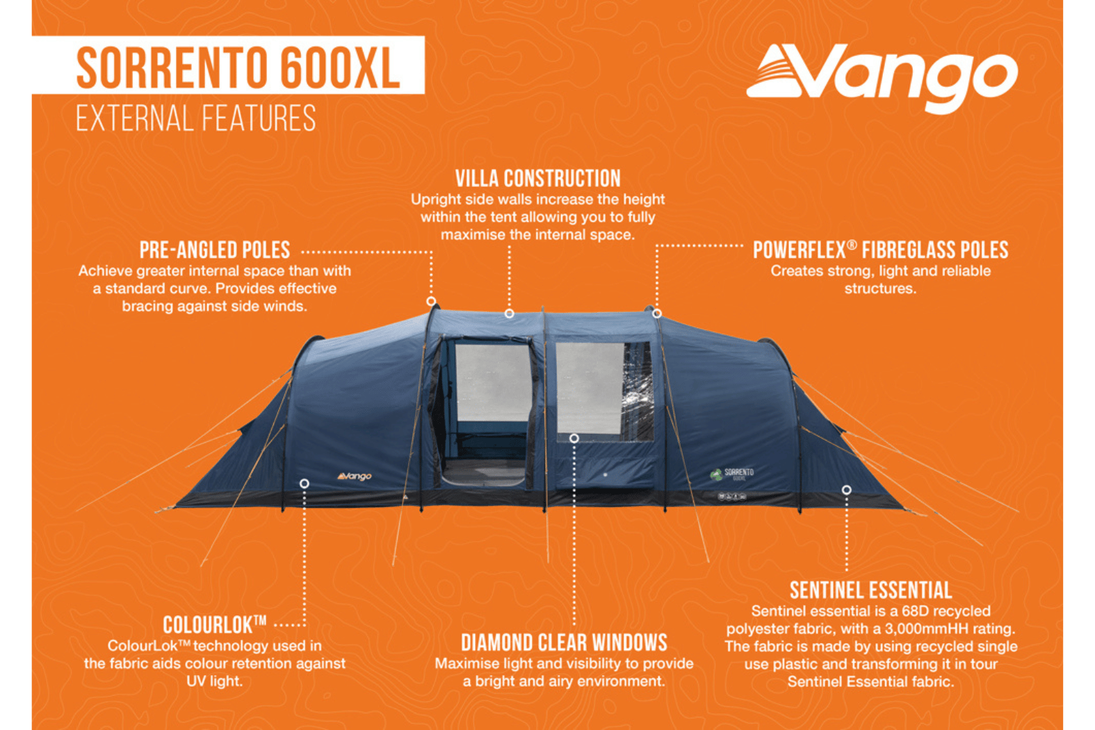 The Vango Sorrento 600xl tent is built with the Sentinel Eco Dura Fabric – With a development focus on the environment we’ve taken single use waste plastic and transformed them into our Sentinel Eco Fabric thus slashing Co2 emissions. The introduction of our ColourLok technology and coupled with a 3,000mm HH waterproof rating, ensures market leading quality and performance, plus supporting our outdoor environment.
