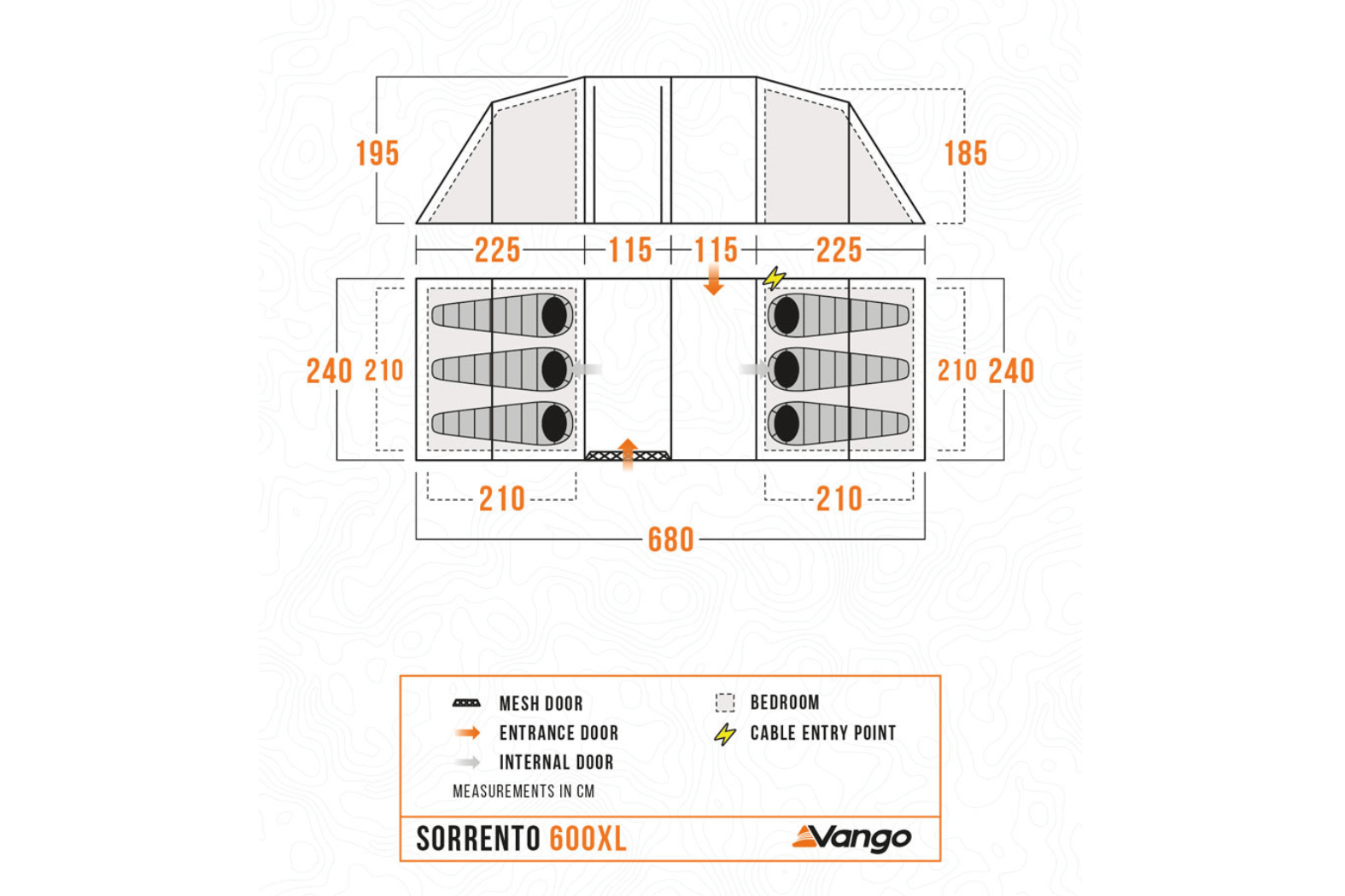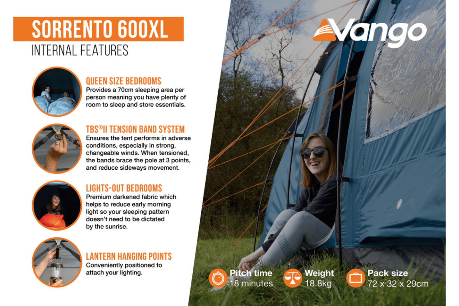 The Vango Sorrento 600XL tent is mirrored (vis a vis) layout, the Sorrento tunnel tent provides a generously proportioned living and sleeping area. Not only does the sewn-in groundsheet make pitching easier, but it also minimises drafts and bugs. Diamond clear windows offering excellent views of the outside while the privacy curtains can be adjusted to your liking.