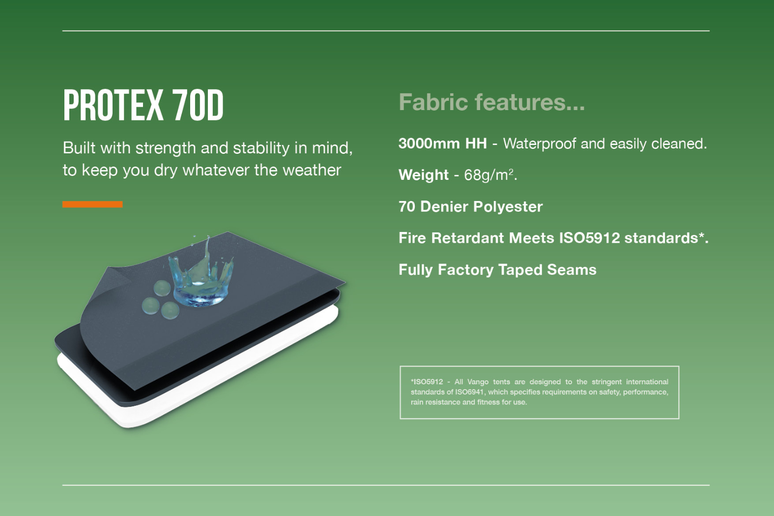 - Protex® 70 Denier polyester flysheet with 3000 mm HH for waterproofing