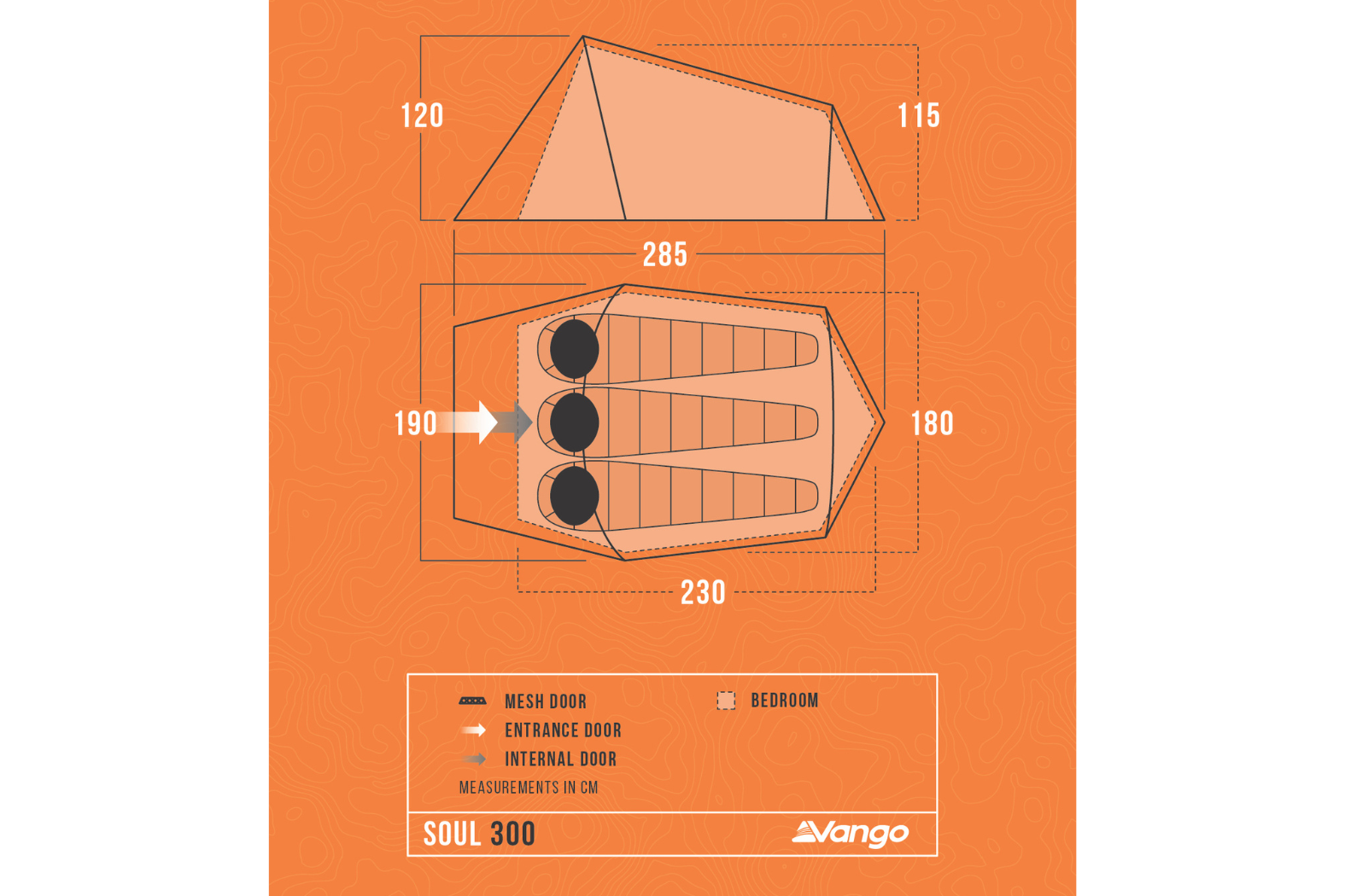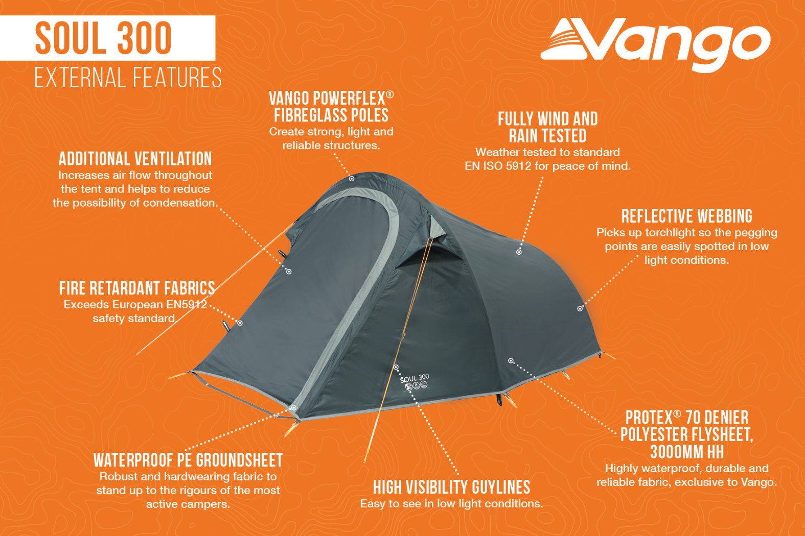 The Soul 300 weighs roughly 2.9 kg, which makes it easy to carry across longer distances. Moreover, the pack size of around 52 × 17 × 17 cm fits neatly inside smaller rucksacks or panniers. In addition, the tent includes reflective webbing and high-visibility guylines for safer pitching at night. Furthermore, integrated lantern points and inner pockets support tidy organisation during multi-day trips.