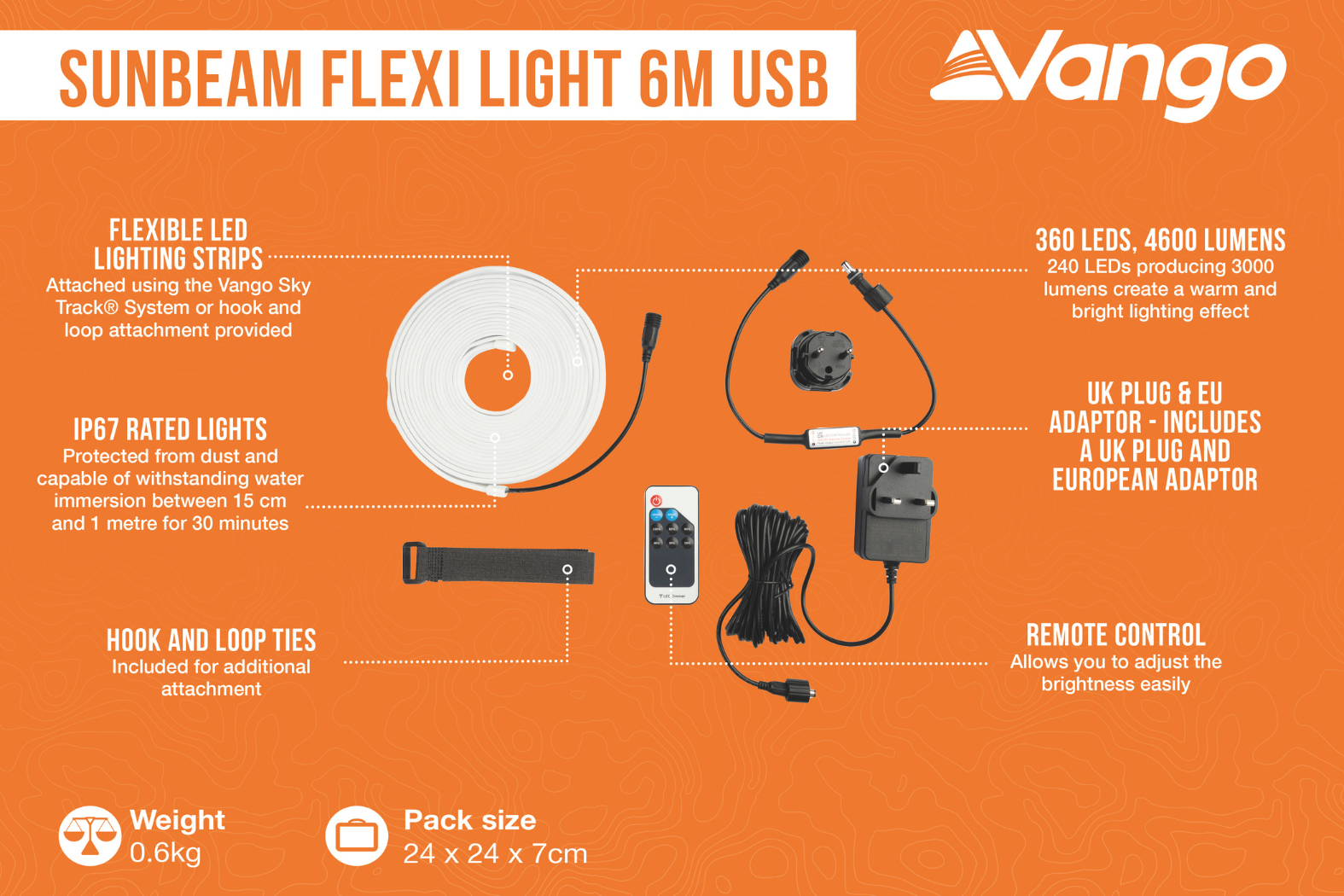 With its long 6-metre length, the Vango Sunbeam Flexi Light 6m flexible LED camping light provides broad coverage across larger tents and awnings. Moreover, 360 LEDs produce a bright, warm lighting effect that keeps your interior well lit. In addition, the flexible strip bends easily around curves and surfaces, letting you customise placement for maximum effect. Furthermore, the remote control allows simple brightness adjustment without reaching the light itself, making operation intuitive and hassle-free.