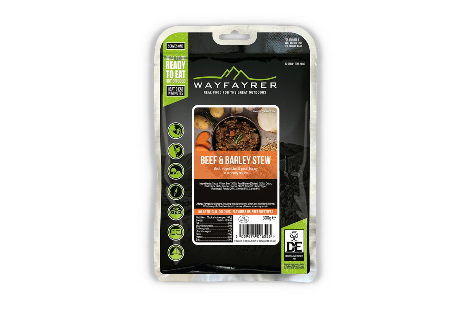 Designed as part of a robust range of outdoor meals, the Wayfayrer Beef & Barley Stew provides substantial energy in a lightweight form. A 300 g pouch delivers nearly 400 kcal, helping sustain you during extended activity. Moreover, its balanced mix of protein, carbohydrates and fibre helps support energy levels after exertion. In addition, the long shelf life means you can pack it for months without worrying about spoilage.