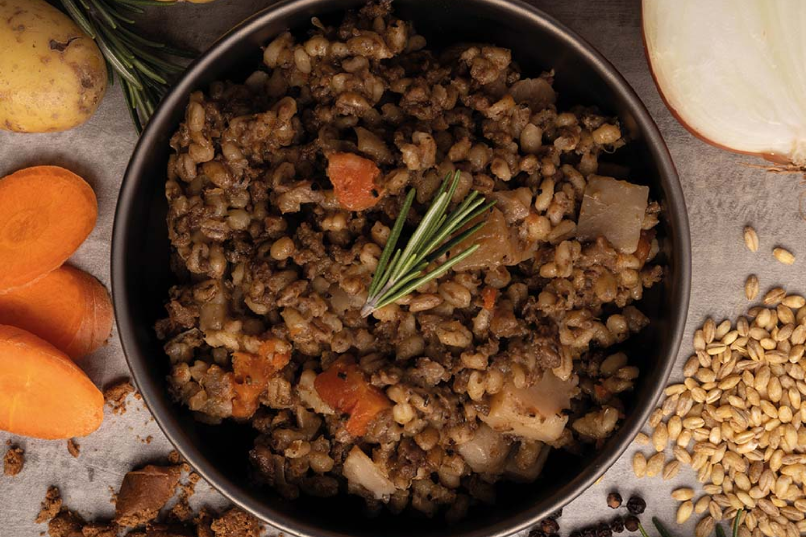 Tender beef, pearl barley and chunky vegetables in a rich sauce
