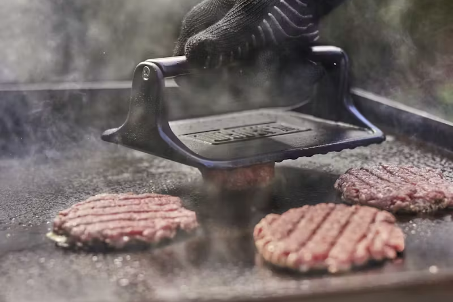 - Weighted to press burgers, paninis, and keep bacon from curling
