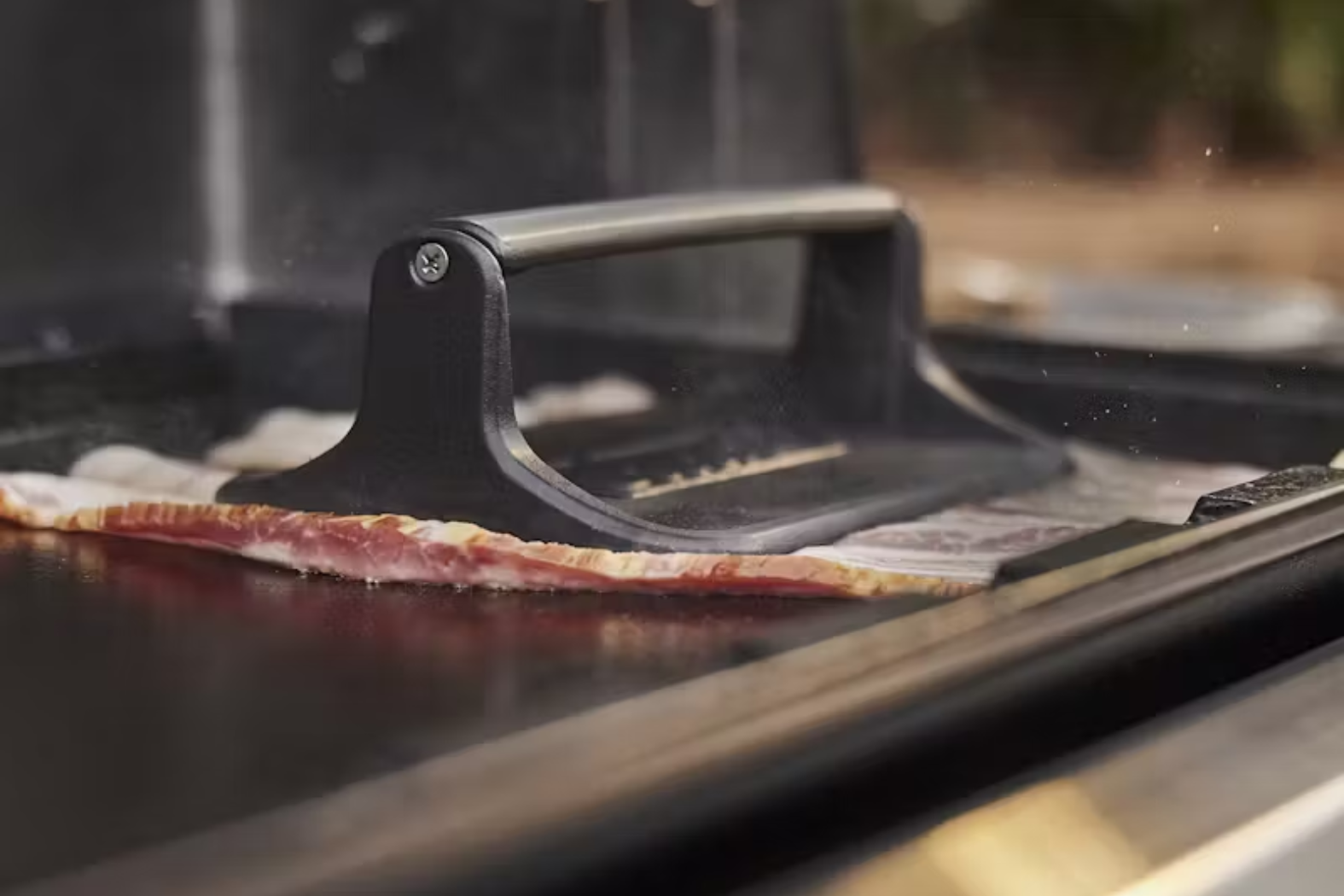 Keep your bacon from curling, your paninis crispy, and your burgers smashed with the Weber Griddle Press. Its ideal weight and size will help make your griddle creations turn out great. You can press up to 4 strips of bacon at once, and its textured design helps lift food off cleanly.