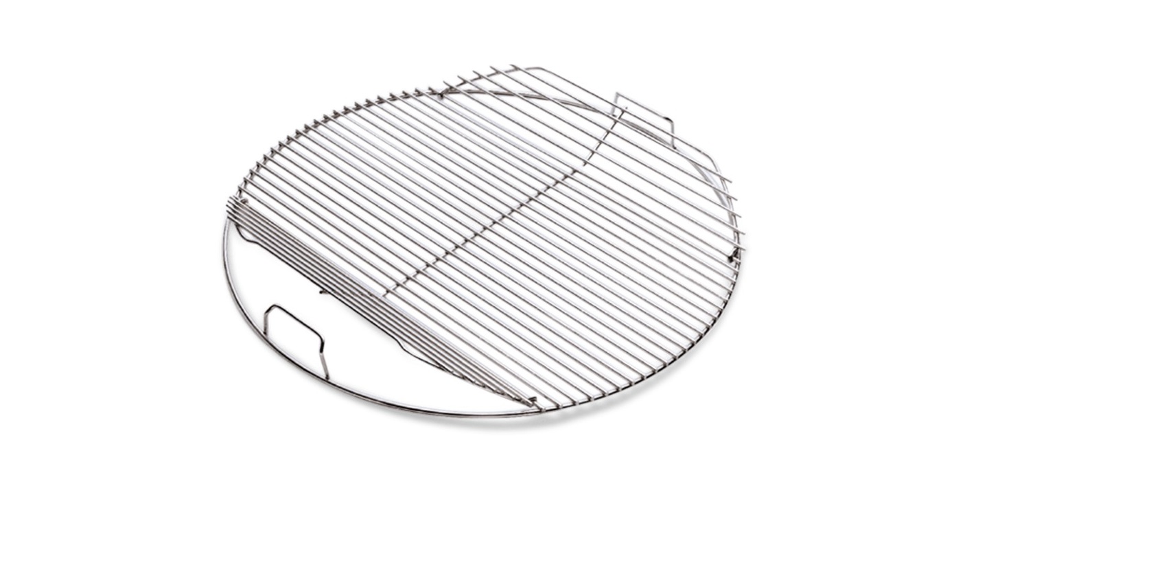 The advantage of having a hinged grate is that extra charcoal can easily be added to the kettle by simply lifting the hinged sides without having to displace the food or remove the entire grate.