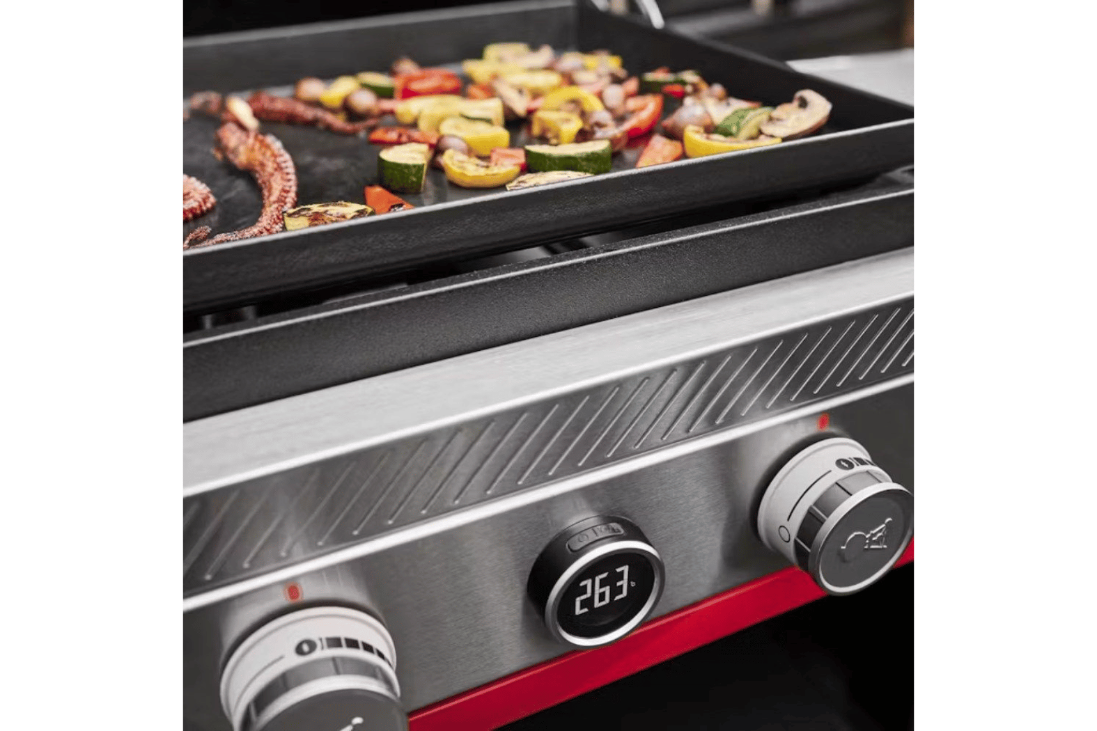The Weber SLATE GPD 76 cm Premium Griddle achieves temperatures above 260 °C, giving you excellent searing ability for meats, vegetables and flat-top favourites. Furthermore, the digital temperature display shows the true cooktop temperature, improving accuracy and reducing guesswork. Independent burner controls create flexible heat zones, allowing you to sauté on one side while searing on the other.
