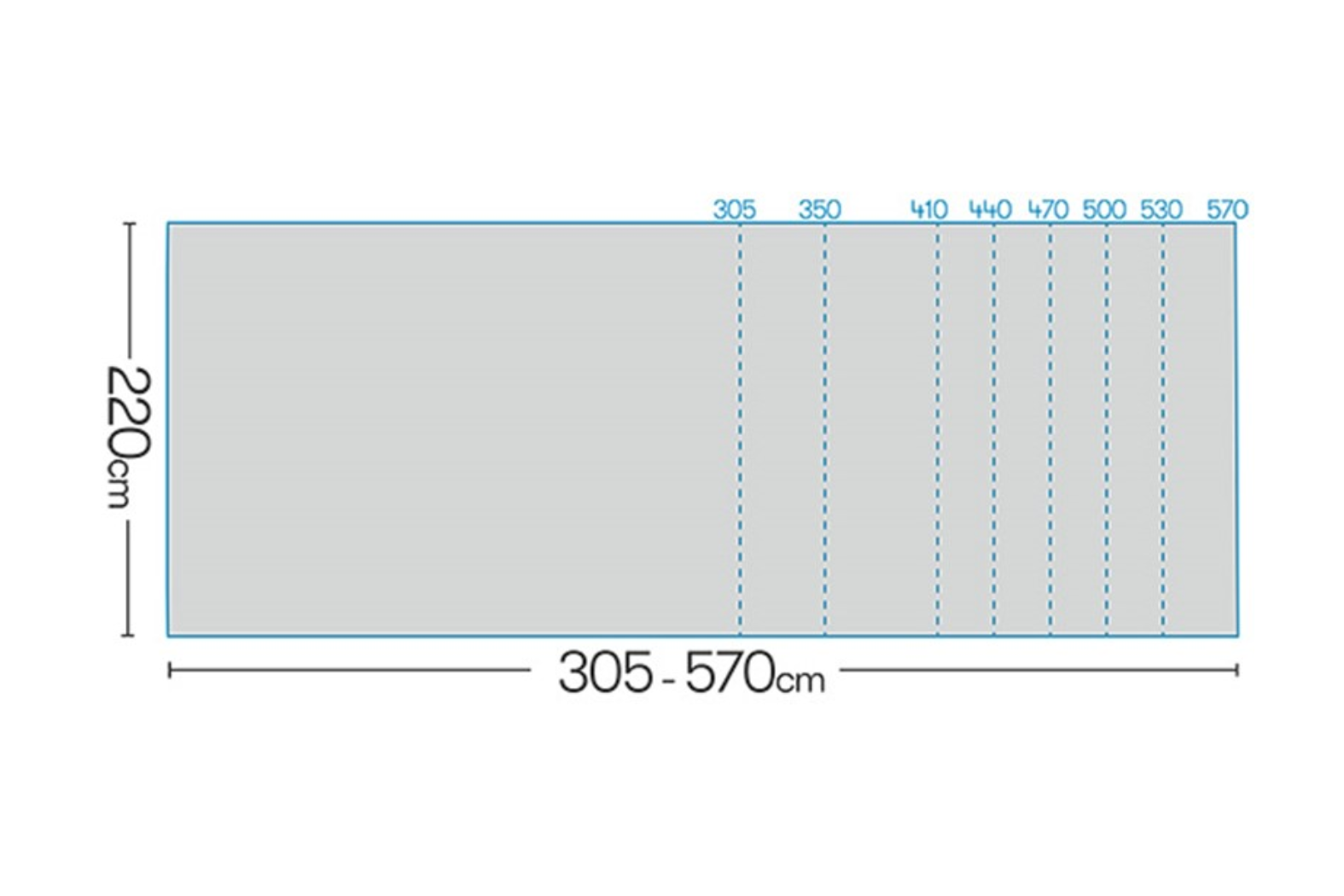 This canopy series supports a variety of widths—305 cm (for Vega/Mars 330), 350 cm (for Vega 375), 410 cm (Pluto/Galaxy size 7), and 440 cm (Galaxy size 8 / Ceres size 7) — each with a consistent depth of approx. 220 cm. It can either attach to your caravan’s awning rail or slide into the front keder of compatible Westfield Air awnings.