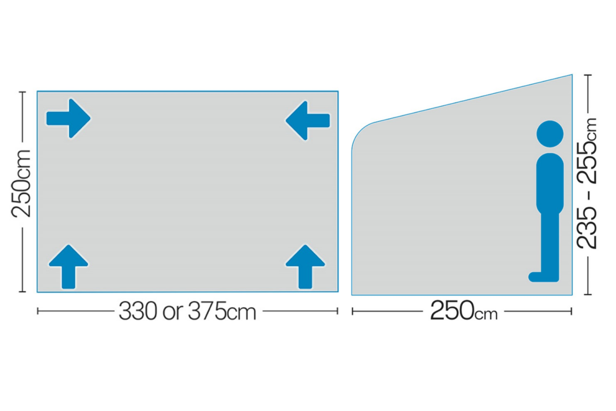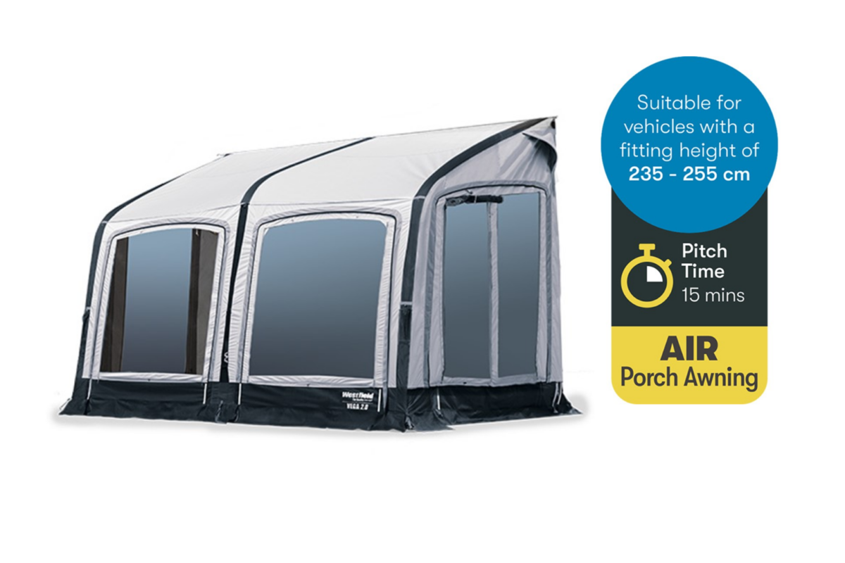 Elevate your caravan setup with the Westfield Vega 2.0 375 Air Porch Awning, offering generous space, premium construction and fast air-frame pitching. With a width of 375 cm, this model gives you a large footprint smartly designed for comfort, style and functionality—whether you’re on a weekend break or taking extended tours.