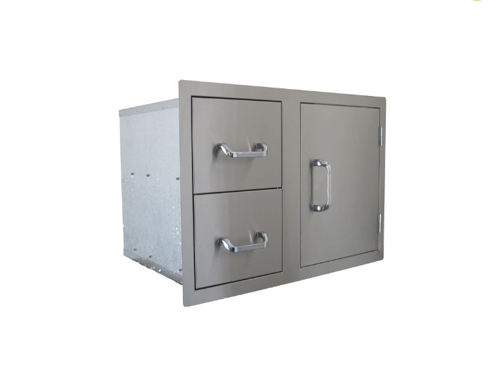 Constructed from 304 stainless steel. The door and drawers combo features durable double hinges and comes as standard with a paper towel dispenser inside, a right-hinged door as well as two sealed drawers.