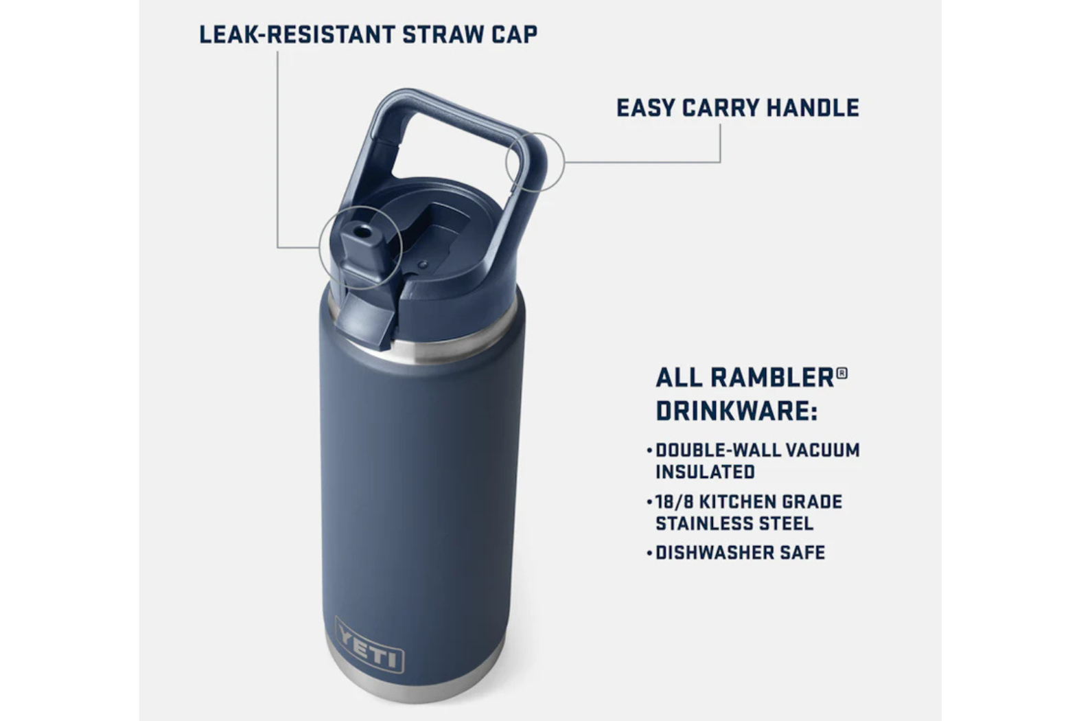 Waste no time hydrating on your morning hikes, kayak trips, and daily commutes with our flip and sip colour-matched straw cap water bottle. The Rambler® 26 oz. Water Bottle is the goldilocks of our bottle line. It holds just the right amount for a day on the boat or at the beach, while still fitting in your YETI® backpack. It comes with a colour-matching straw cap that’s leak resistant and easy to carry (thanks to the TripleHaul™ Handle). Like all Rambler® Bottles, it’s over-engineered and double-wall insulated to keep your water cold until the last sip, and it’s dishwasher safe for easy cleaning. Plus, it comes with a wide-straw insert, so you get more drink with every sip.